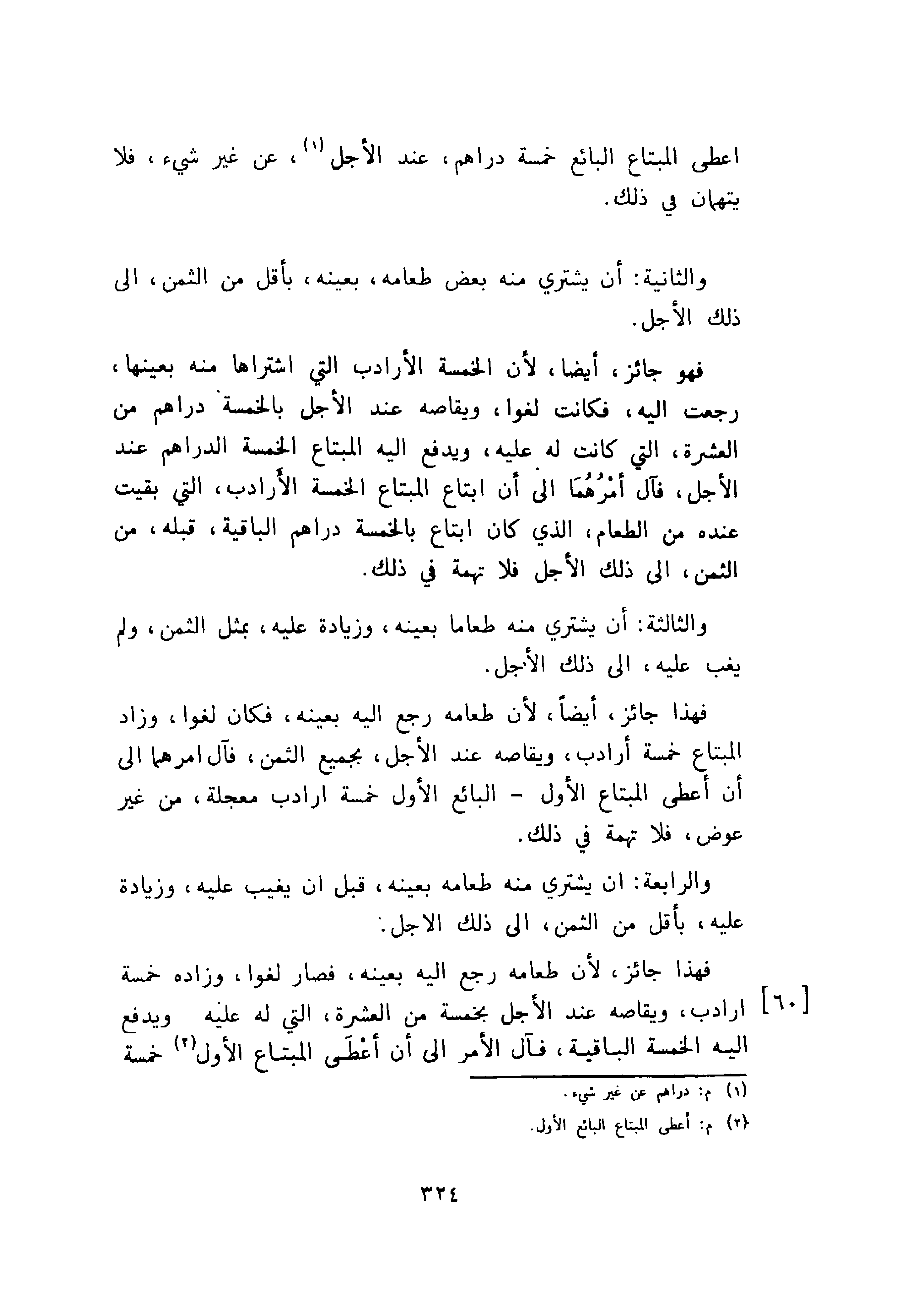 والثالثة: أن يشترى منه طعاما بعينه، وزيادة عليه، بمثل الثمن، ولم يغب عليه، إلى ذلك الأجل فهذا جائز، أيضا، لأن طعامه رجع اليه بعينه، فكان لغوا، وزاد المبتاع خمسة أرادب، ويقاصه عند الأجل، بجميع الثمن، فآل امرهما إلى أن أعطى المبتاع الأول - البائع الأول خمسة ارادب معجلة، من غير عوض، فلا تهمة في ذلك.