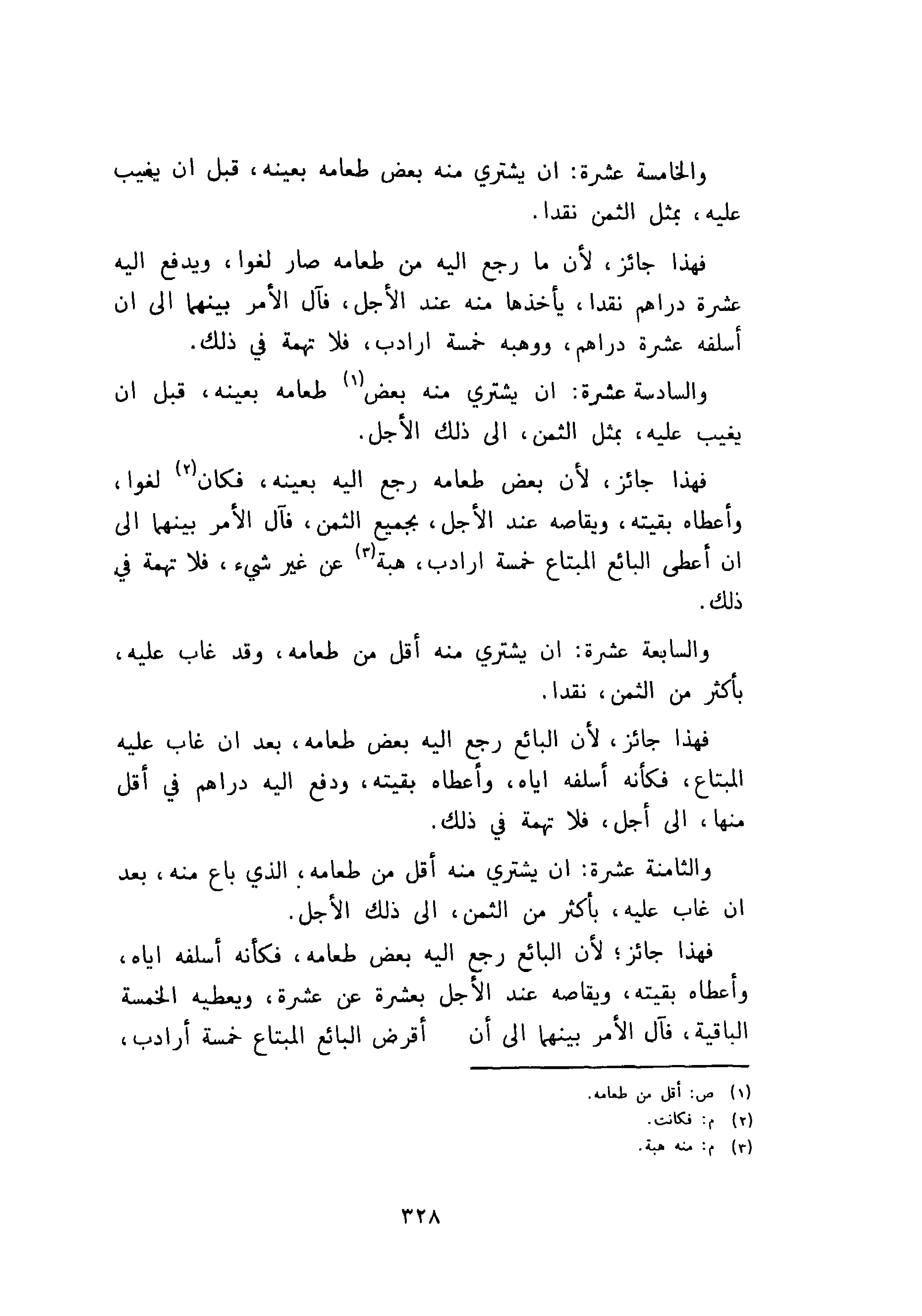 والثامنة عشرة: أن يشترى منه أقل من طعامه، الذي باع منه، بعد ان غاب عليه، بأكثر من الثمن إلى ذلك الأجل.