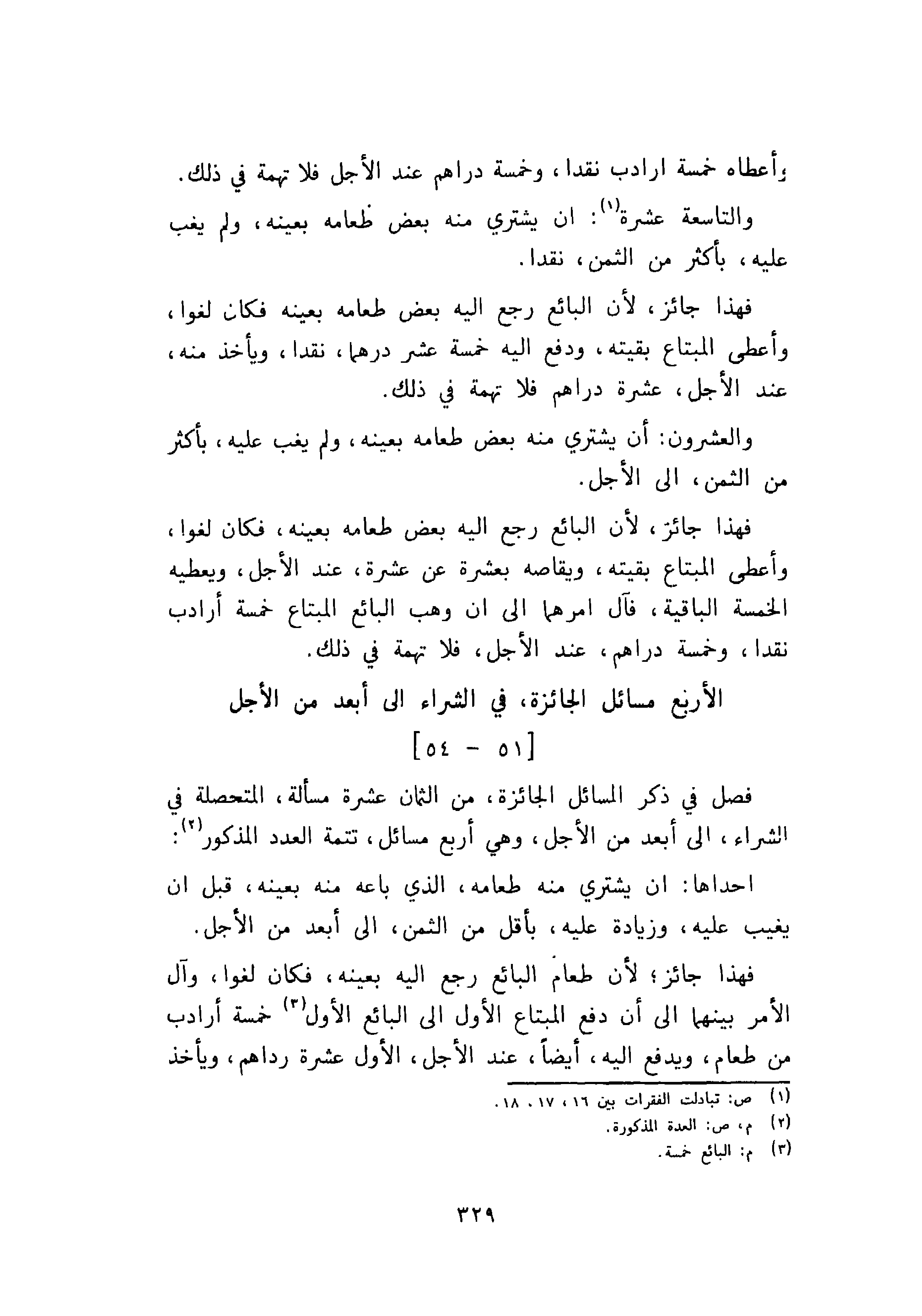 فصل في ذكر المسائل الجائزة، من الثمان عشرة مسألة، المتحصلة في الشراء، إلى أبعد من الأجل، وهي أربع مسائل، تتمة العدد المذكور: