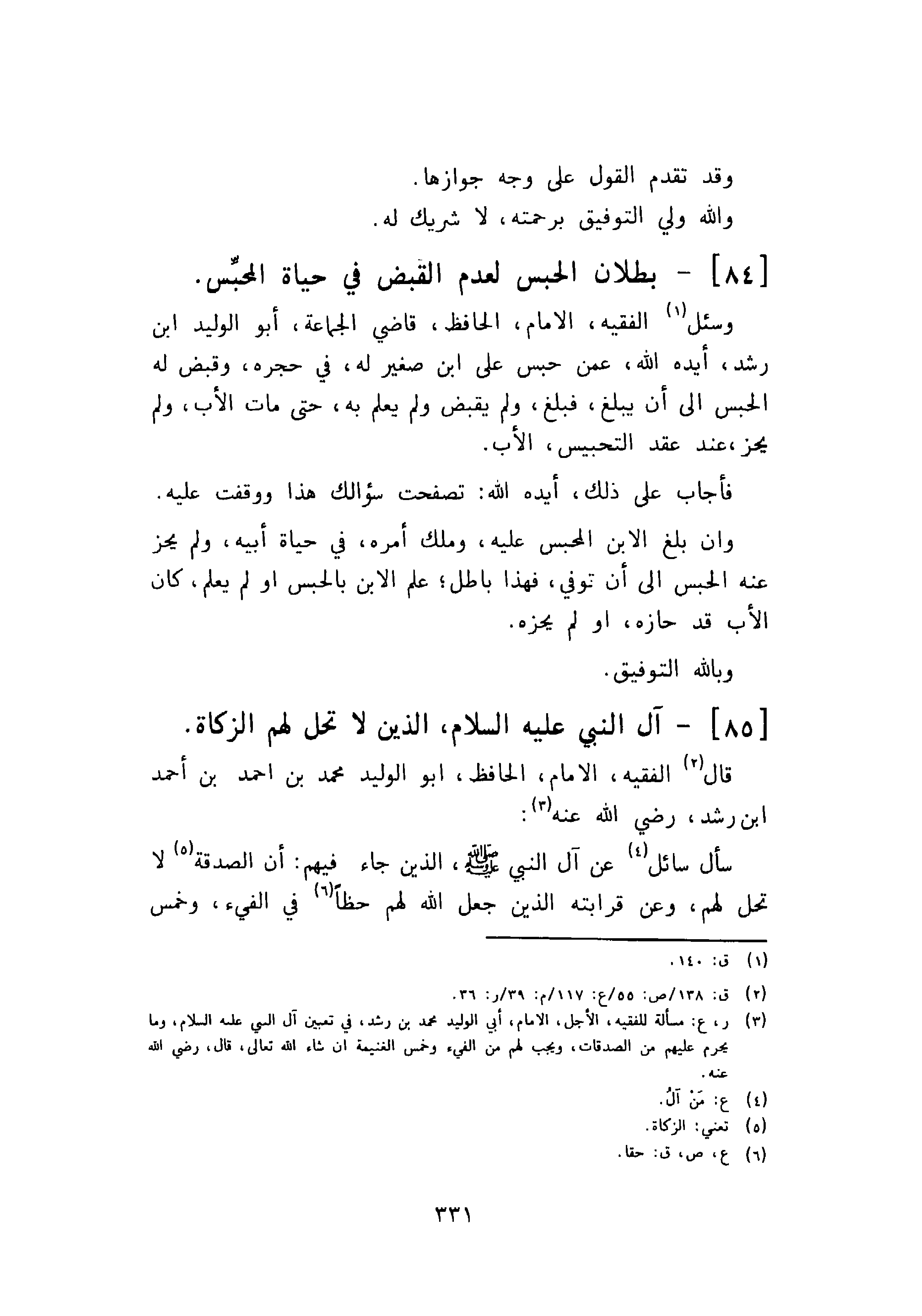 وسئل الفقيه، الإمام، الحافظ، قاضي الجماعة، أبو الوليد ابن رشد أيده الله، عمن حبس على ابن صغير له، في حجره، وقبض له الحبس إلى أن يبلغ، فبلغ، ولم يقبض ولم يعلم به، حتى مات الأب، ولم يجز، عند عقد التحبيس، الأب.