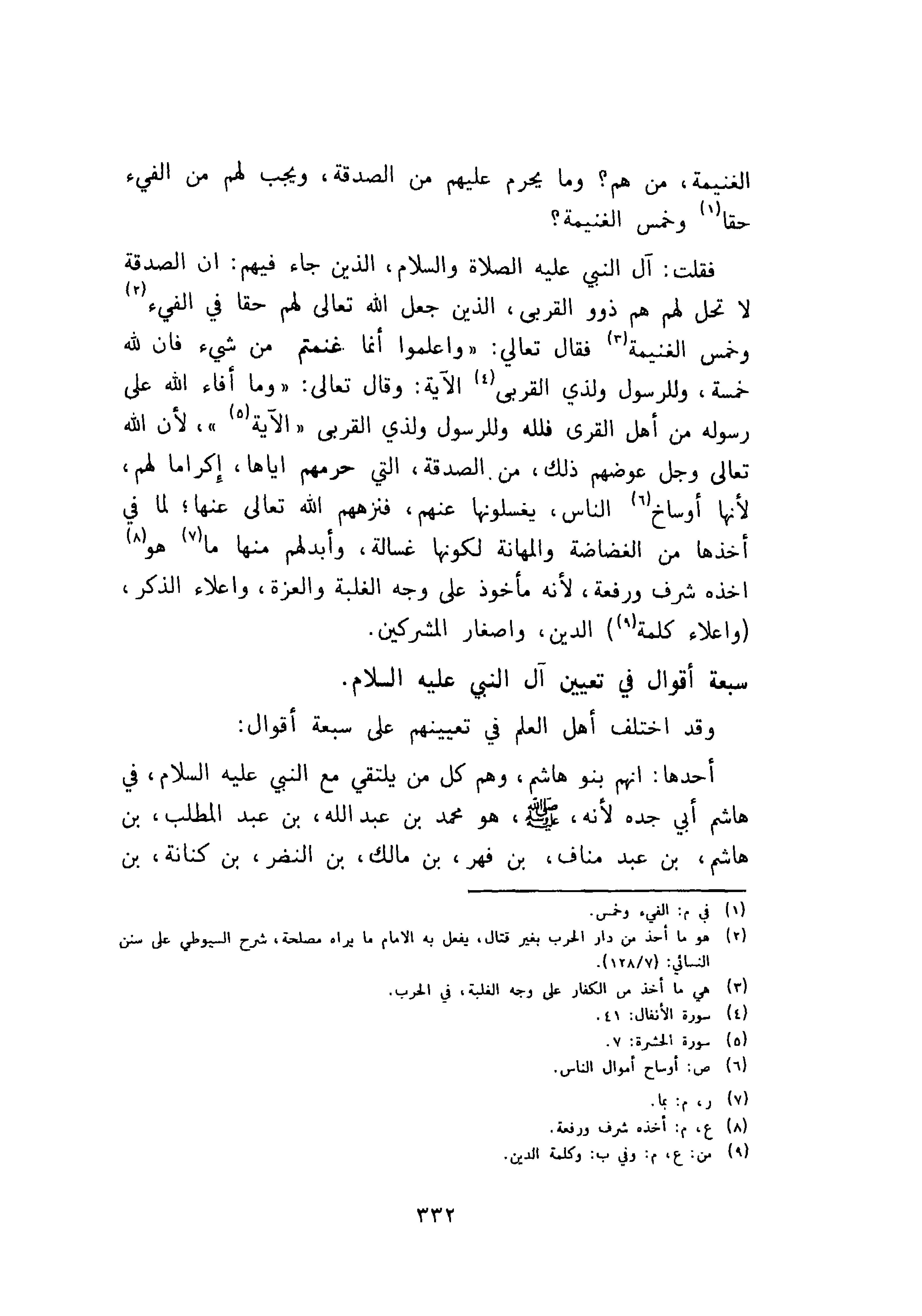 أحدها: انهم بنو هاشم، وهم كل من يلتقي مع النبي عليه السلام، في هاشم أبي جده لأنه، صلى الله عليه وسلم هو محمد بن عبد الله بن عبد المطلب بن هاشم بن عبد مناف بن فهر بن مالك بن النضر بن كنانة بن