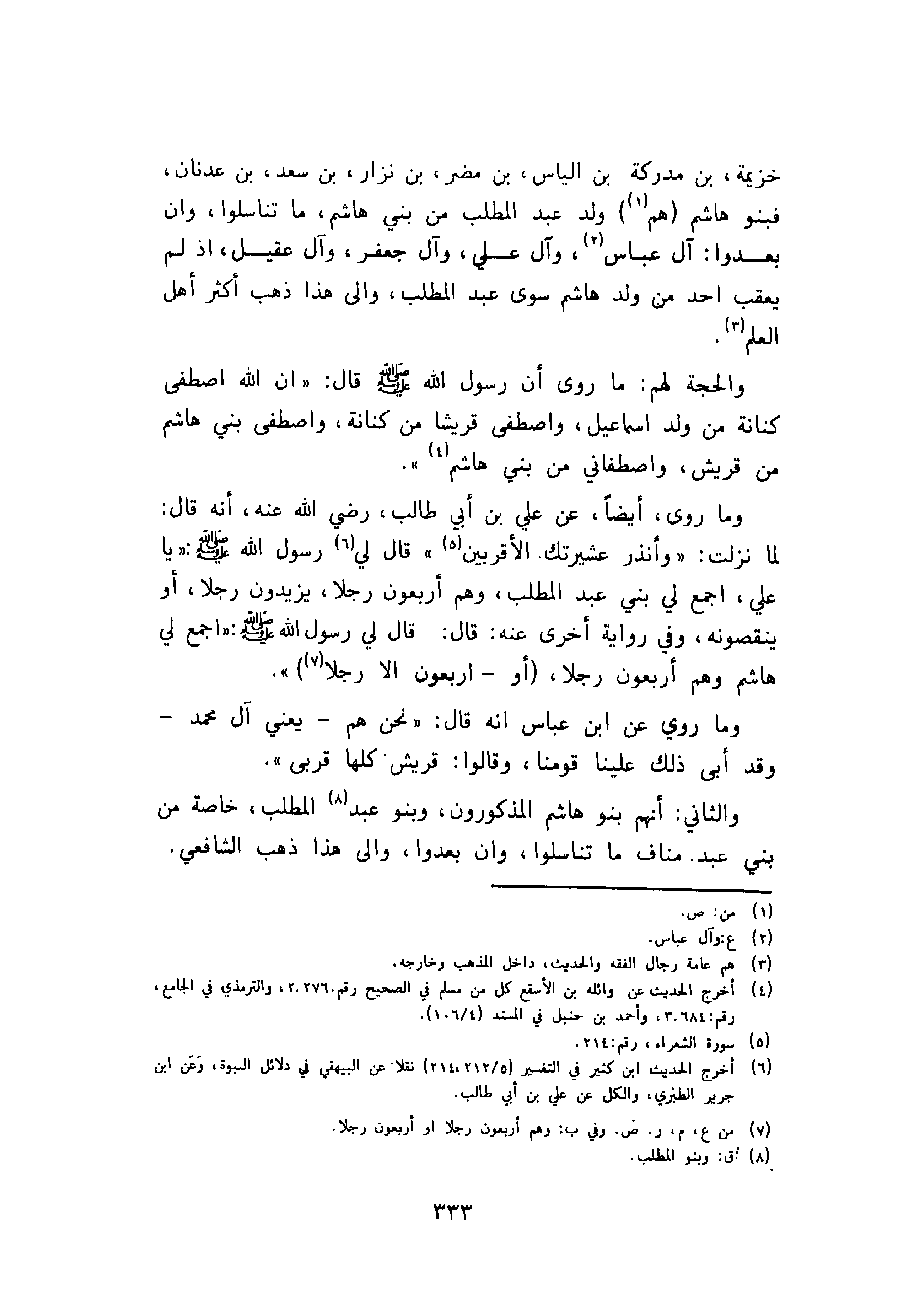 والثاني: أنهم بنو هاشم المذكورون وبنو عبد المطلب خاصة من بني عبد مناف ما تناسلوا وان بعدوا والى هذا ذهب الشافعي.
