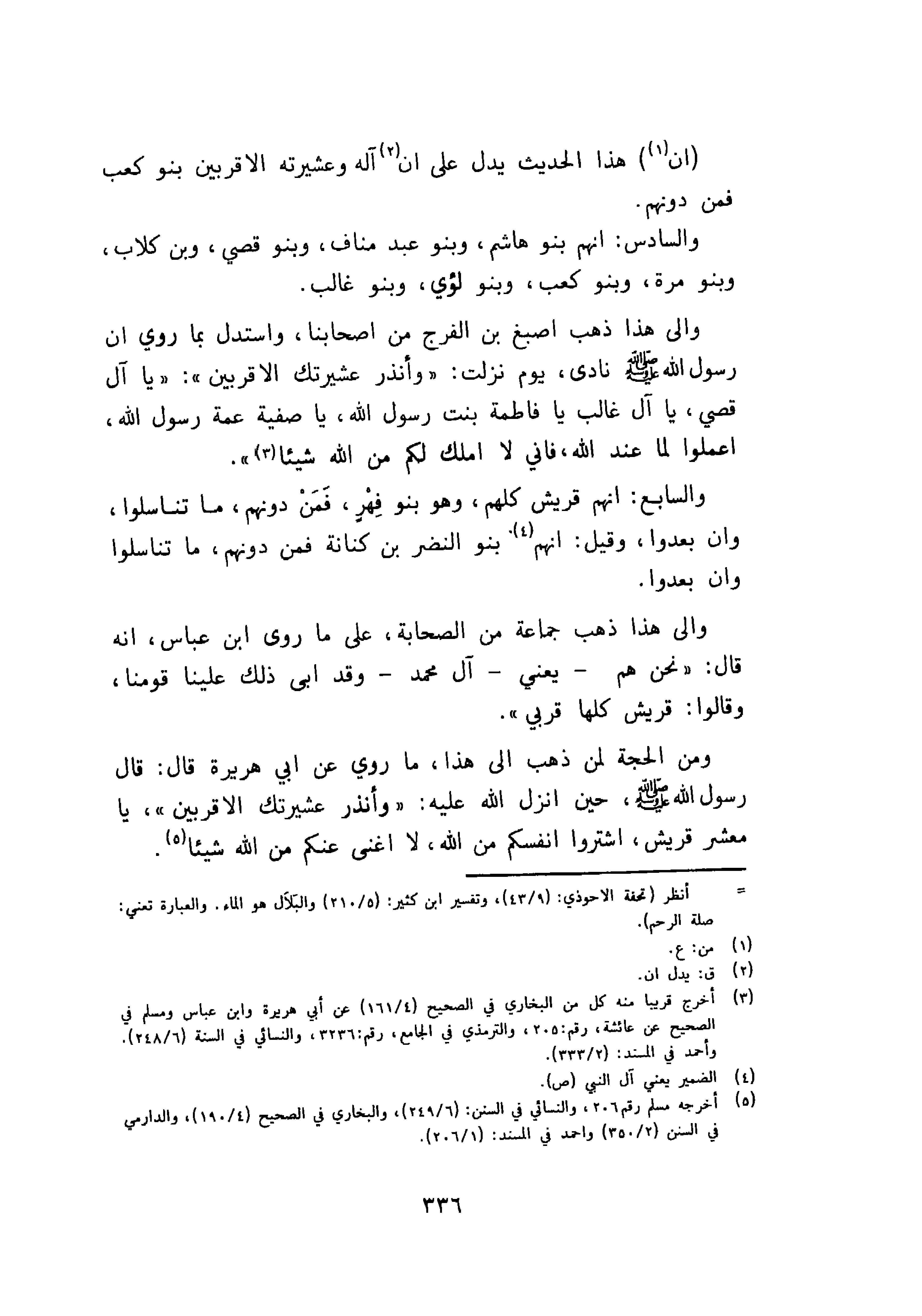 ومن الحجة لمن ذهب إلى هذا ما روى عن أبي هريرة قال: قال رسول الله صلى الله عليه وسلم حين انزل الله عليه " وأنذر عشيرتك الاقربين " يا معشر قريش واشتروا انفسكم من الله، لا اغنى عنكم من الله شيئاً.