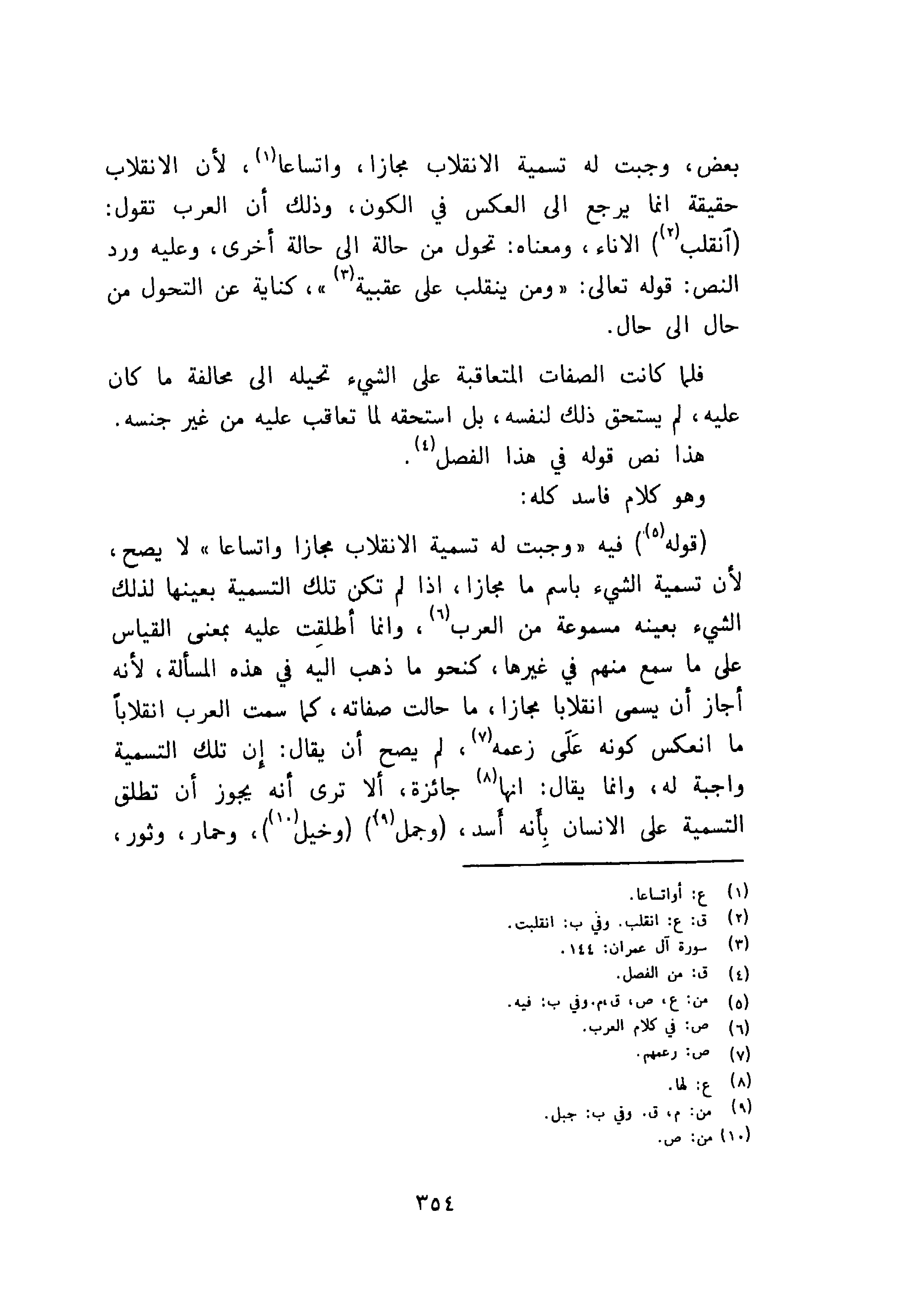 قوله فيه وجبت له تسمية الانقلاب مجازا واتساعا لا يصح، لأن تسمية الشيء باسم ما مجازا إذا لم تكن تلك التسمية بعينها لذلك الشيء بعينه مسموعة من العرب، وانما أطلقت عليه بمعنى القياس على ما سمع منهم في غيرها، كنحو ما ذهب اليه في هذه المسألة، لأنه أجاز أن يسمى انقلابا مجازا ما حالت صفاته، كما سمت العرب انقلابا ما نعكس كونه على زعمه، لم يصح أن يقال: إن تلك التسمية واجبة له، وانما يقال: انها جائزة ألا ترى أنه يجوز أن تطلق التسمية على الانسان بأنه أسد وجمل وخيل وحمار وثور