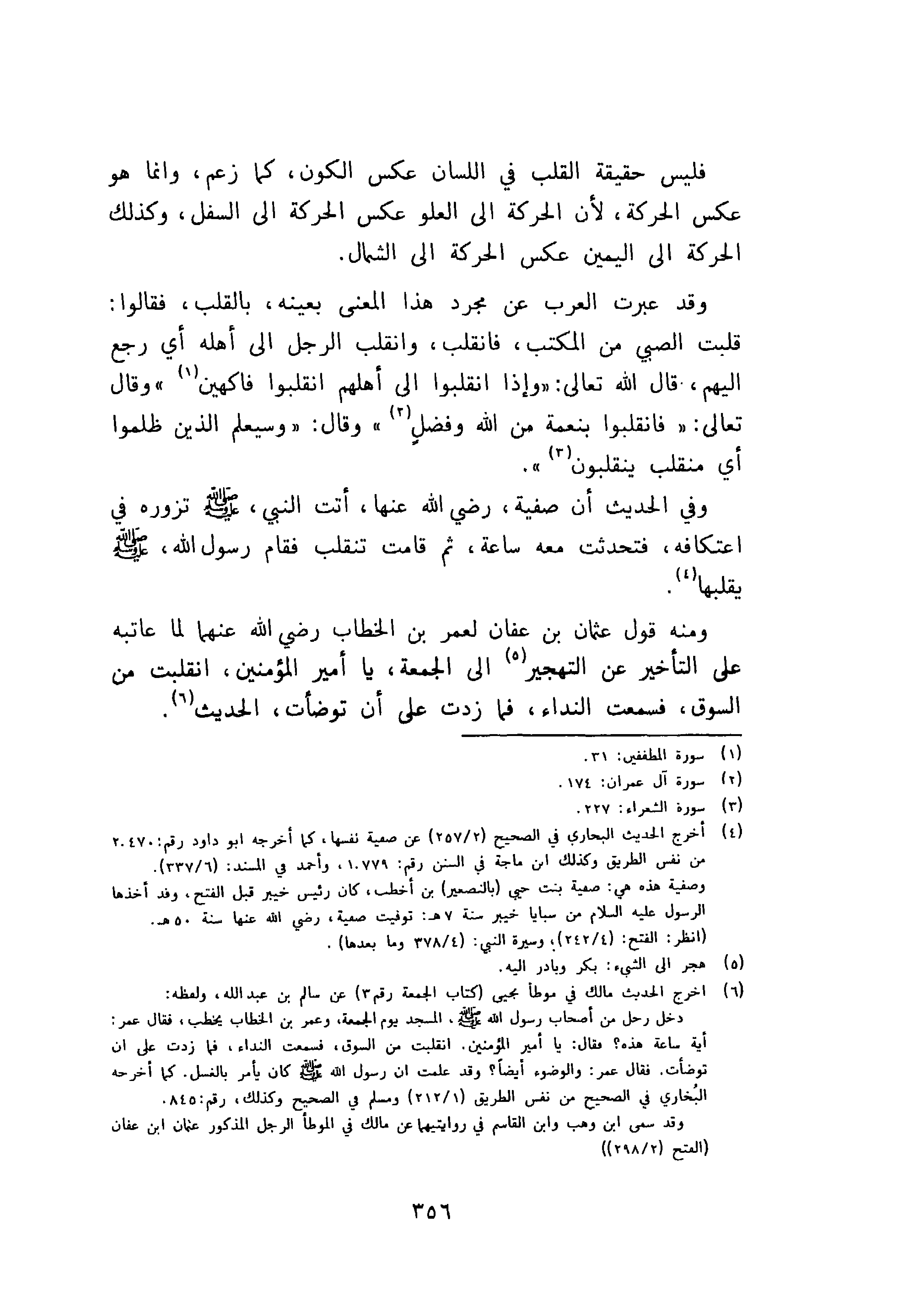 وقد عبرت العرب عن مجرد هذا المعنى بعينه، بالقلب، فقالوا: قلبت الصبي من المكتب، فانقلب وانقلب الرجل إلى أهله أي رجع اليهم،