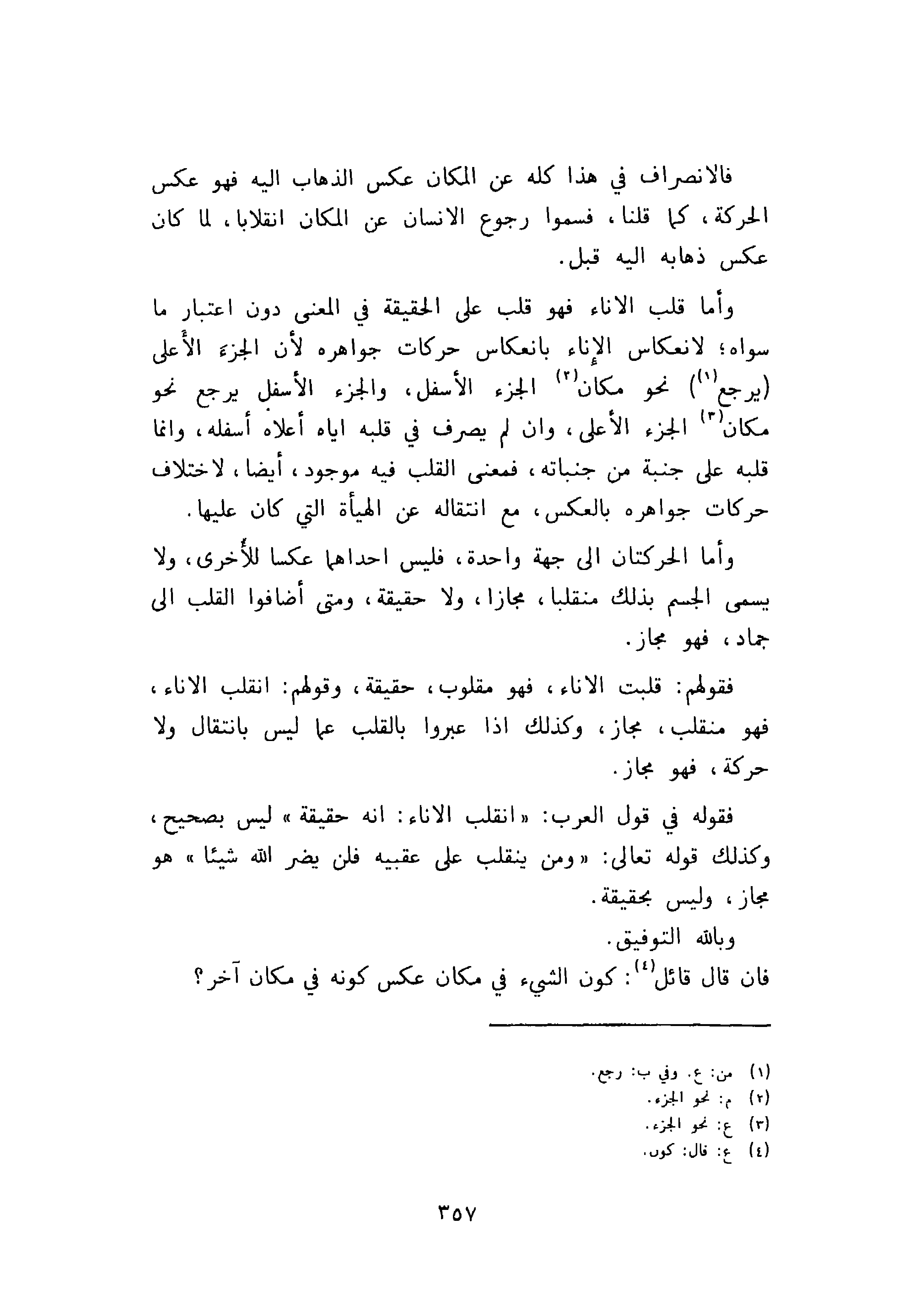 وأما قلب الاناء فهو قلب الحقيقة في المعنى دون اعتبار ما سواه لانعكاس الإناء بانعكاس حركات جواهره لأن الجزء الأعلى يرجع نحو مكان الجزء الأسفل والجزء الأسفل يرجع نحو مكان الجزء الأعلى، وان لم يصرف في قلبه اياه أعلاه أسفله، وانما قلبه على جنبه من جنباته، فمعنى القلب فيه موجود، أيضا، لاختلاف حركات جواهره بالعكس، مع انتقاله عن الهيأة التي كان عليها.