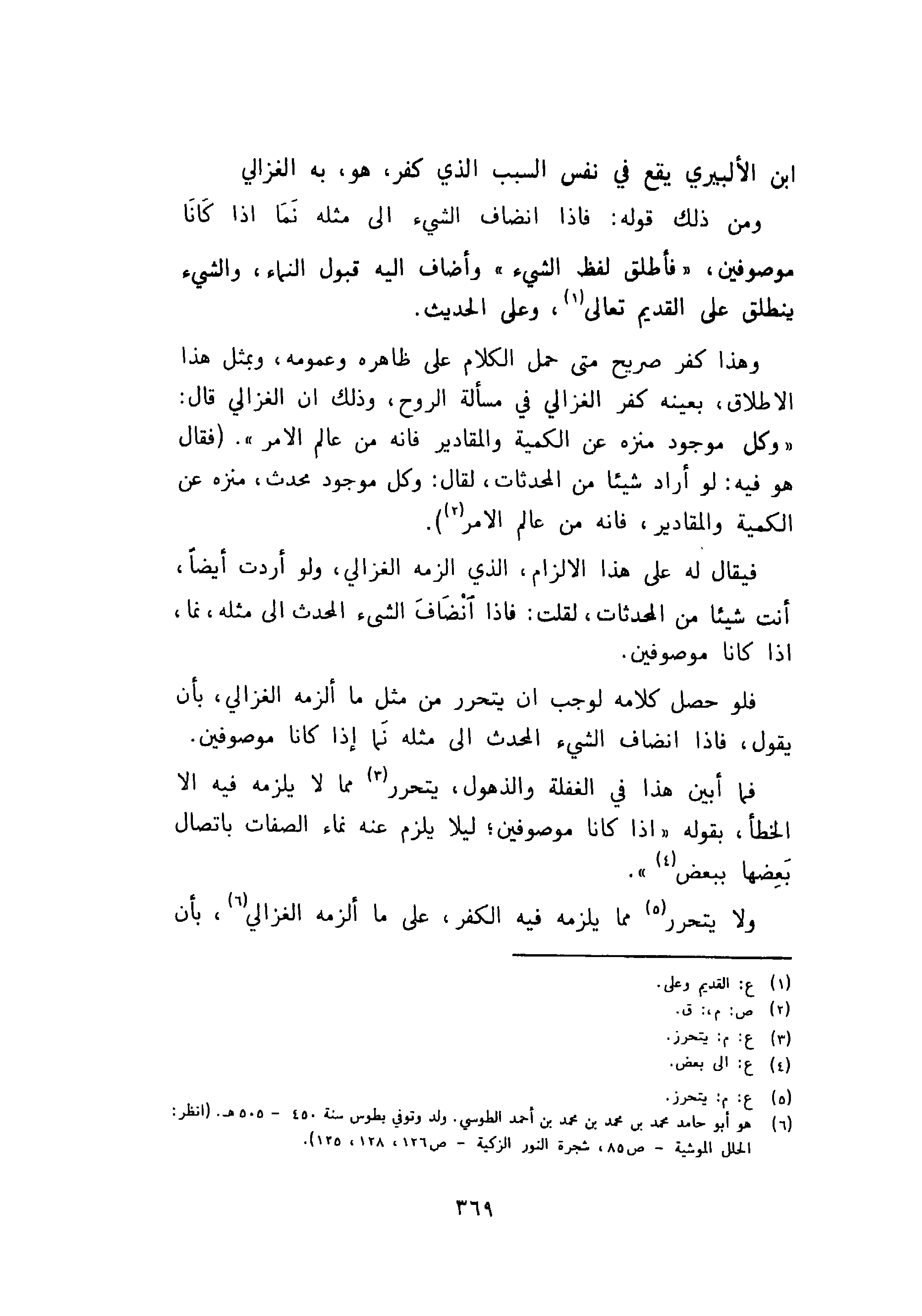 وهذا كفر صريح متى حمل الكلام على ظاهرة وعمومه، وبمثل هذا الاطلاق، بعينه كفر الغزالى في مسألة الروح، وذلك ان الغزالى قال: «وكل موجود منزه عن الكمية والمقادير فانه من عالم الامر». فقال هو فيه: لو أراد شيئاً من المحدثات، لقال: وكل موجود محدث، منزه عن الكمية والمقادير، فانه من عالم الامر.