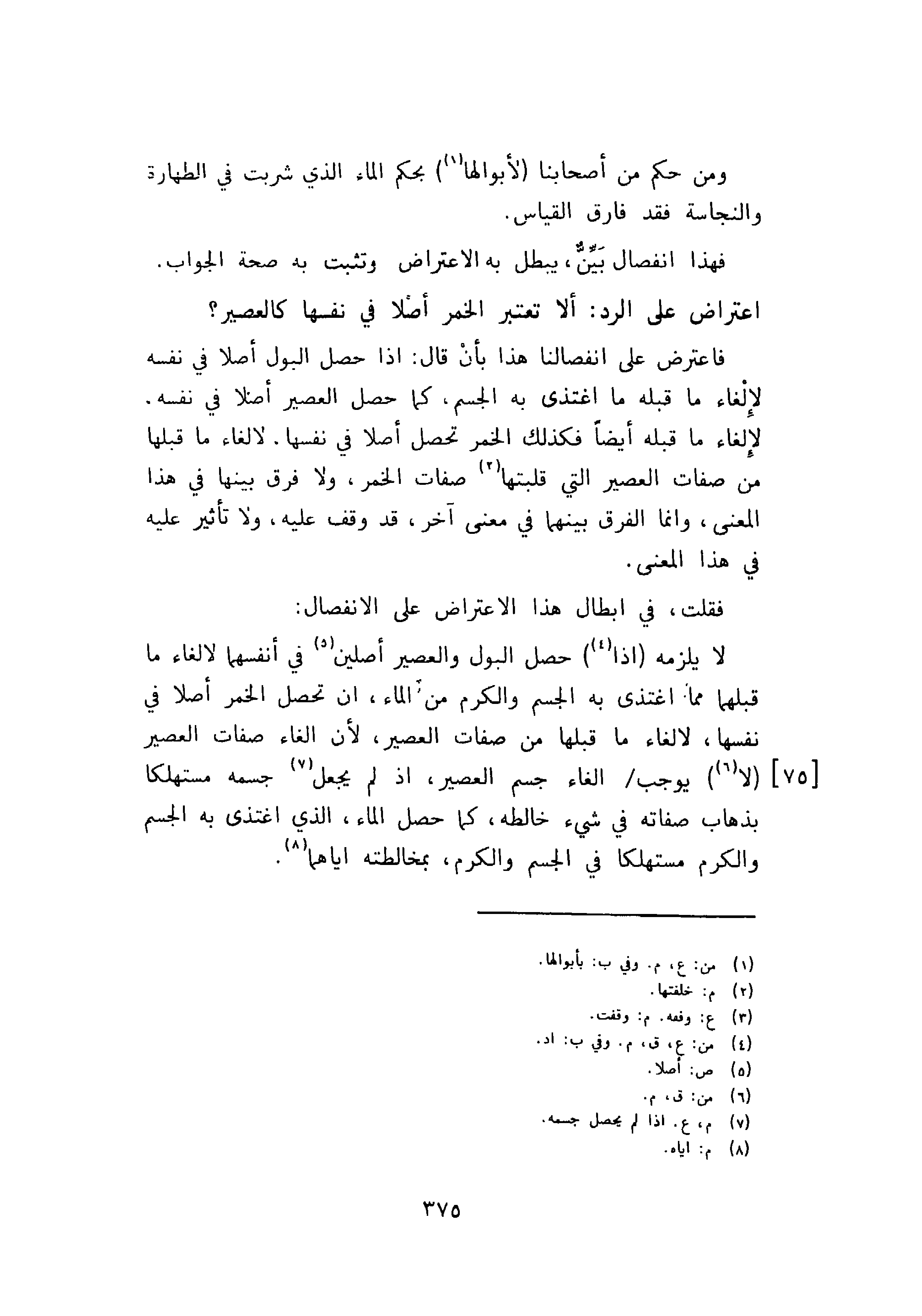 لا يلزمه إذا حصل البول والعصير أصلين في أنفسهما لإلغاء ما قبلهما مما اغتذى به الجسم والكرم من الماء ان تحصل الخمر أصلا في نفسها، لإلغاء ما قبلها من صفات العصير، لأن الغاء صفات العصير [75] لا يوجب الغاء جسم العصير، اذ لم يجعل جسمه مستهلكا بذهاب صفاته في شيء خالطه، كما حصل الماء الذي الذي اغتذى به الجسم والكرم مستهلكا في الجسم والكرم بمخالطته اياهما.
