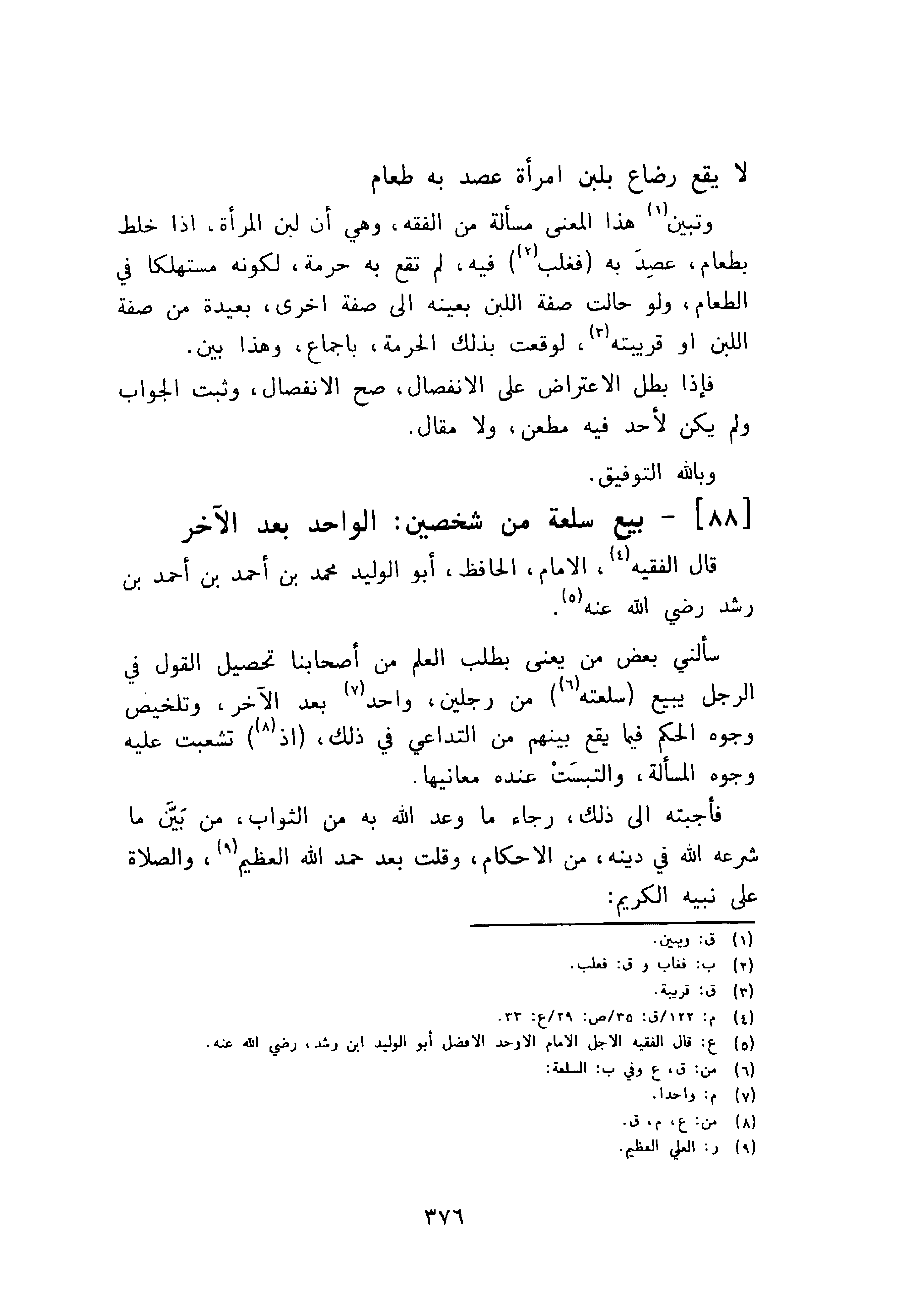 وتبين هذا المعنى مسألة من الفقه، وهى أن لبن المرأة، إذا خلط بطعام، عصد به فغلب فيه، لم تقع به حرمة، لكونه مستهلكا في الطعام، ولو حالت صفة اللبن بعينه إلى صفة اخرى، بعيدةمن صفة اللبن او قريبته، لوقعت بذلك الحرمة، باجماع، وهذا بين. فإذا بطل الاعتراض على الانفصال، صح الانفصال، وثبت الجواب ولم يكن لأحد فيه مطعن، ولا مقال.