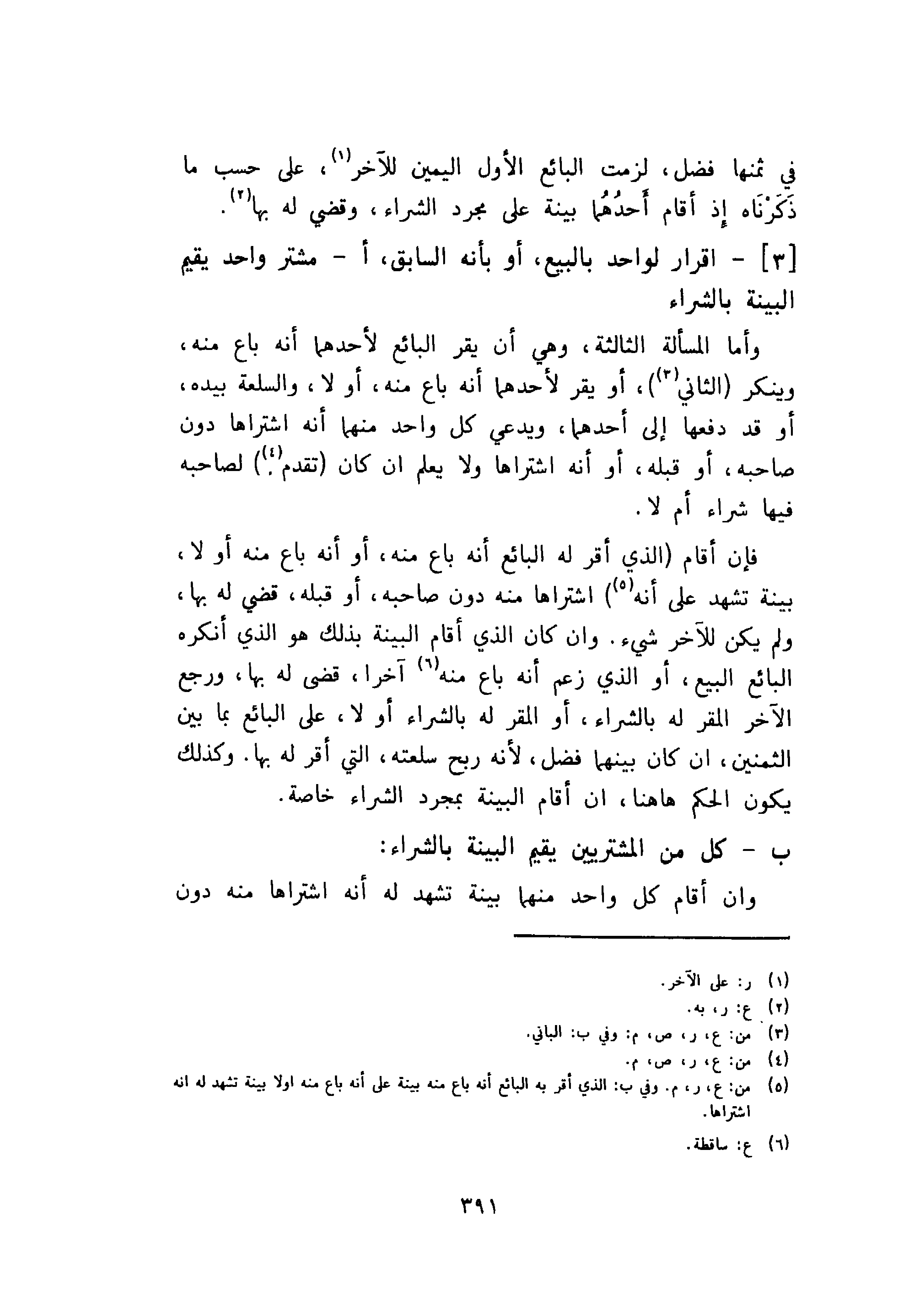 وأما المسألة الثالثة، وهى أن يقر البائع لأحدهما أنه باع منه، وينكر الثانى، أو يقر لأحدهما أنه باع منه، أولا، والسلعة بيده، أو قد دفعها إلى أحدهما، ويدعى كل واحد منهما أنه اشتراها دون صاحبه، أو قبله، أو أنه اشتراها ولا يعلم ان كان تقدم لصاحبه فيها شراء أم لا.