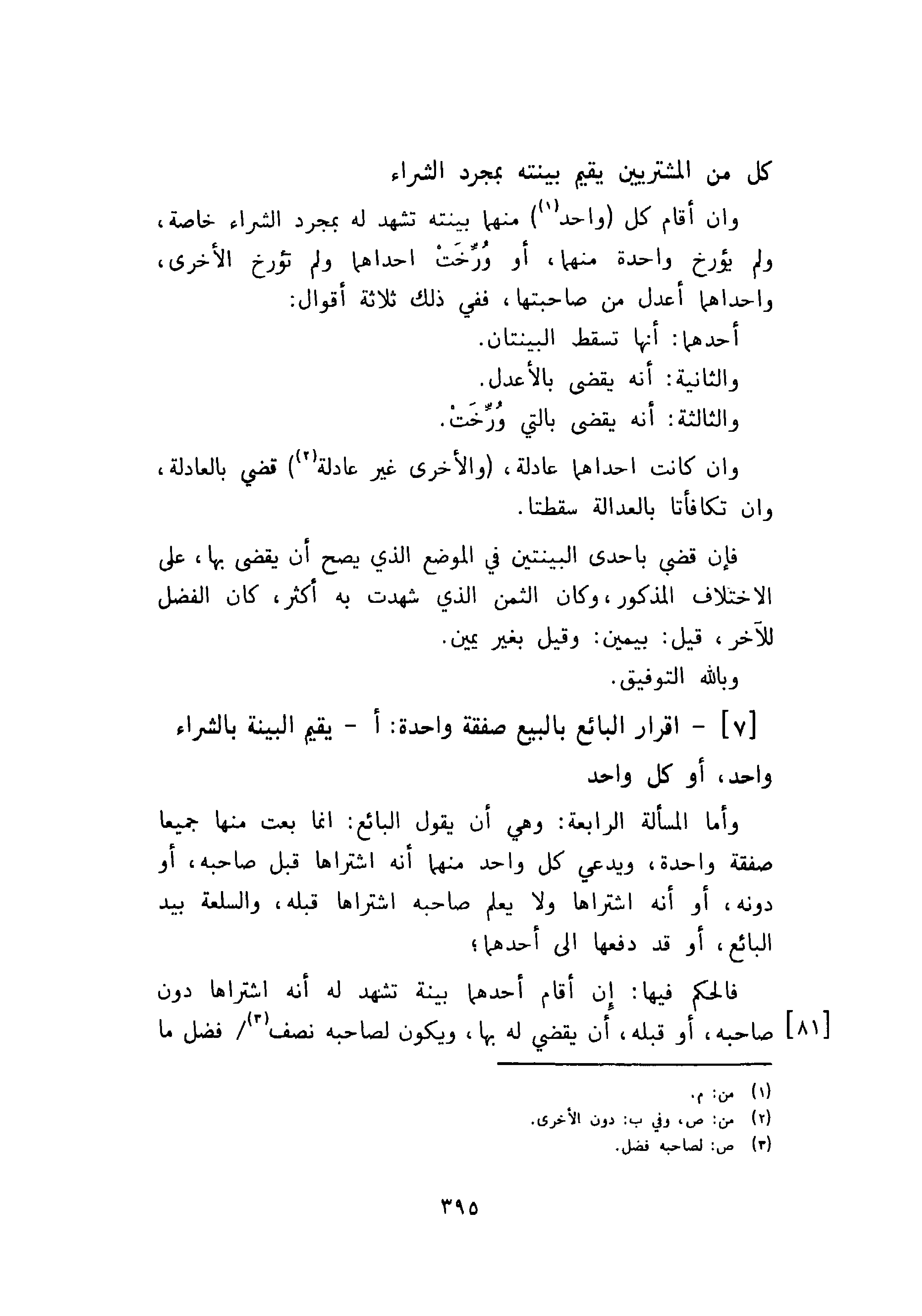 [7]- اقرار البائع بالبيع صفقة واحدة: أ - يقيم البينة بالشراء واحد، أو كل واحد