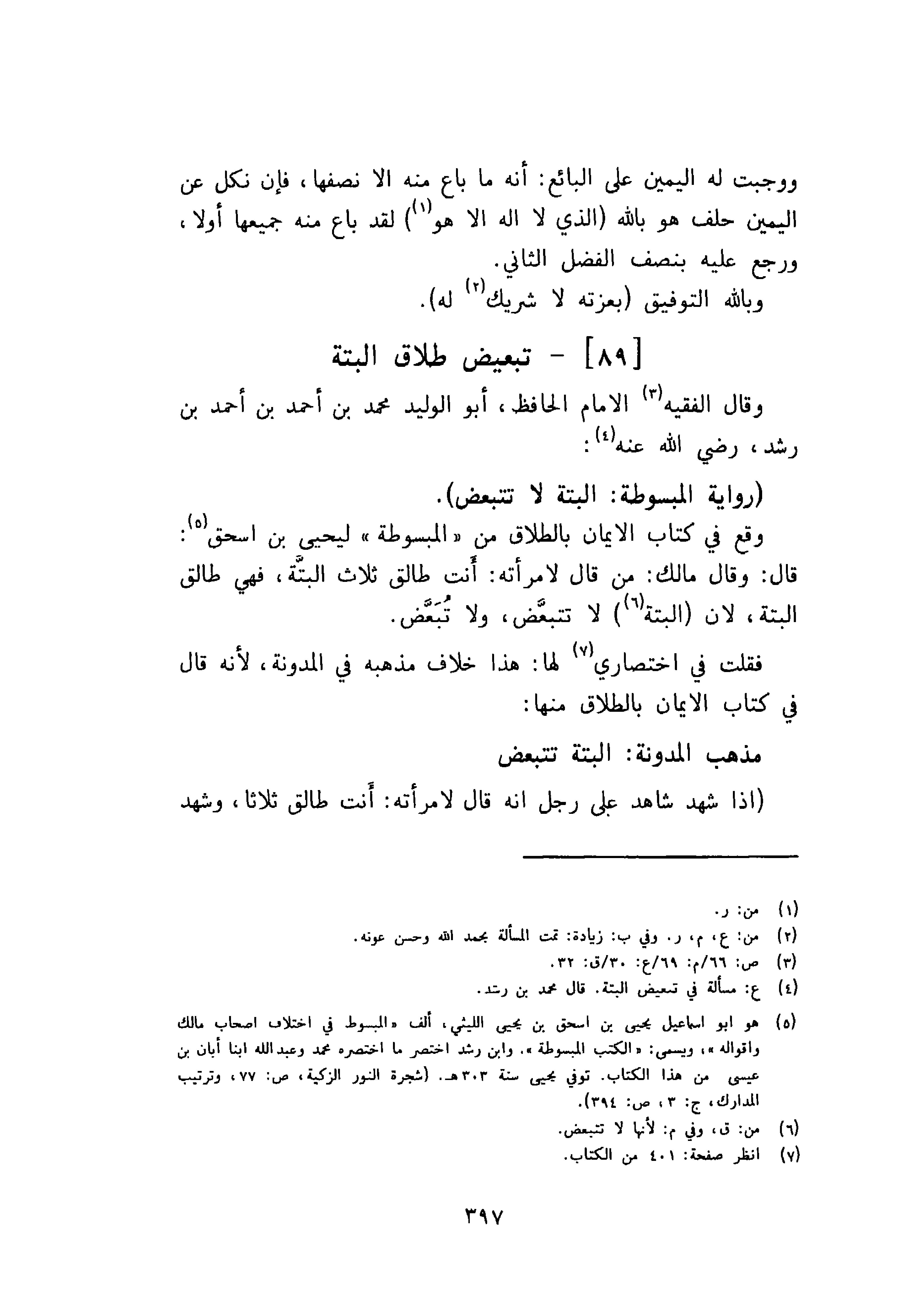 وقع في كتاب الايمان بالطلاق من المبسوطة ليحيى بن اسحق قال: وقال مالك: من قال لامرأته: أنت طالق ثلاث النتة، فهي طالق البتة، لان البتة لا تتبعض، ولا تبعض.