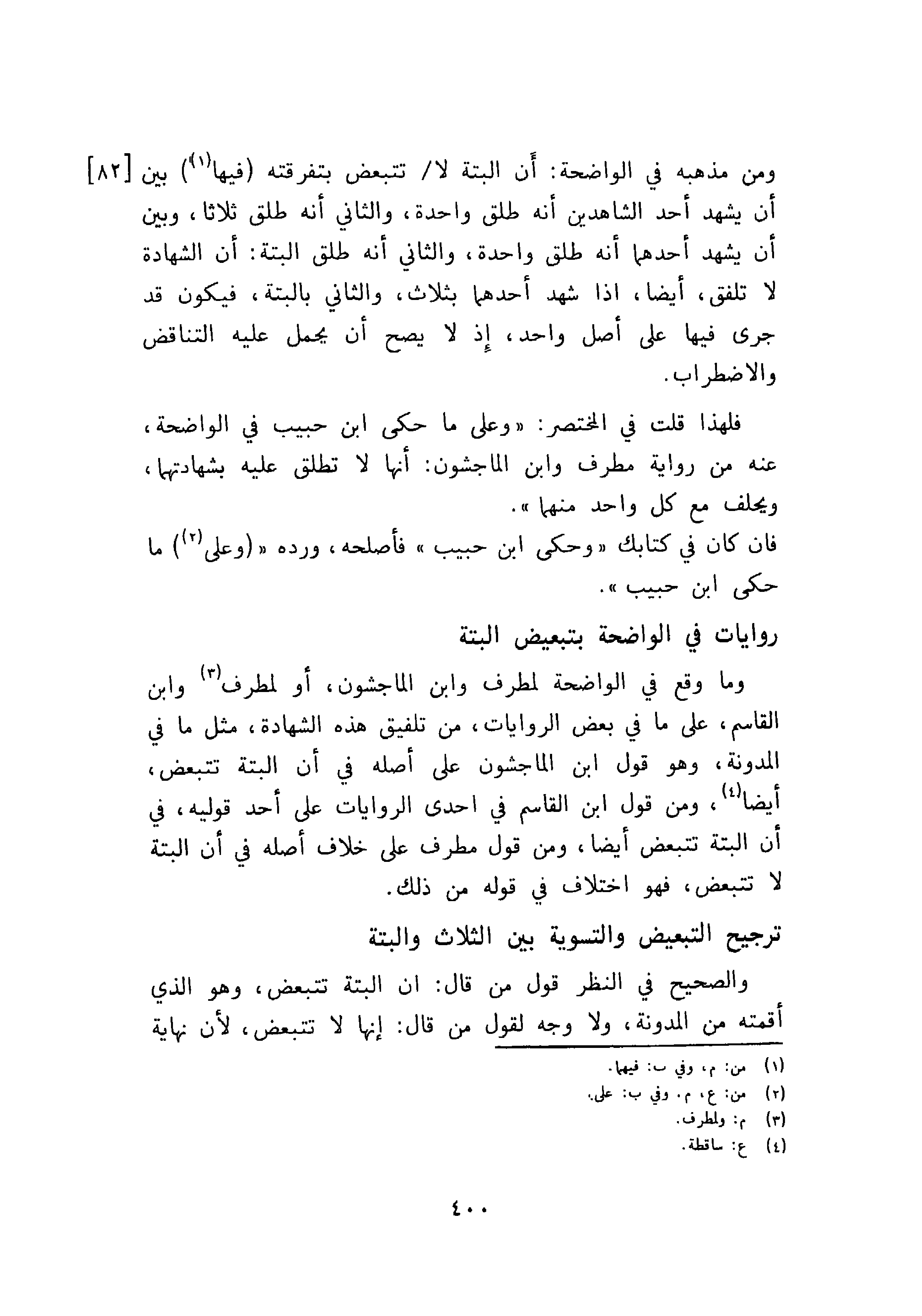 وما وقع في الواضحة لمطرف وابن الماجشون، او المطرف وابن القاسم، على ما في بعض الروايات، من تلفيق هذه الشهادة، مثل ما في المدونة، وهو قول ابن الماجشون على أصله في أن البتة تتبعض، أيضا، ومن قول ابن القاسم في احدى الروايات على أحد قوليه، في أن البتة تتبعض أيضا، ومن قول مطرف على خلاف أصله في أن البتة لا تتبعض، فهو اختلاف في قوله من ذلك.