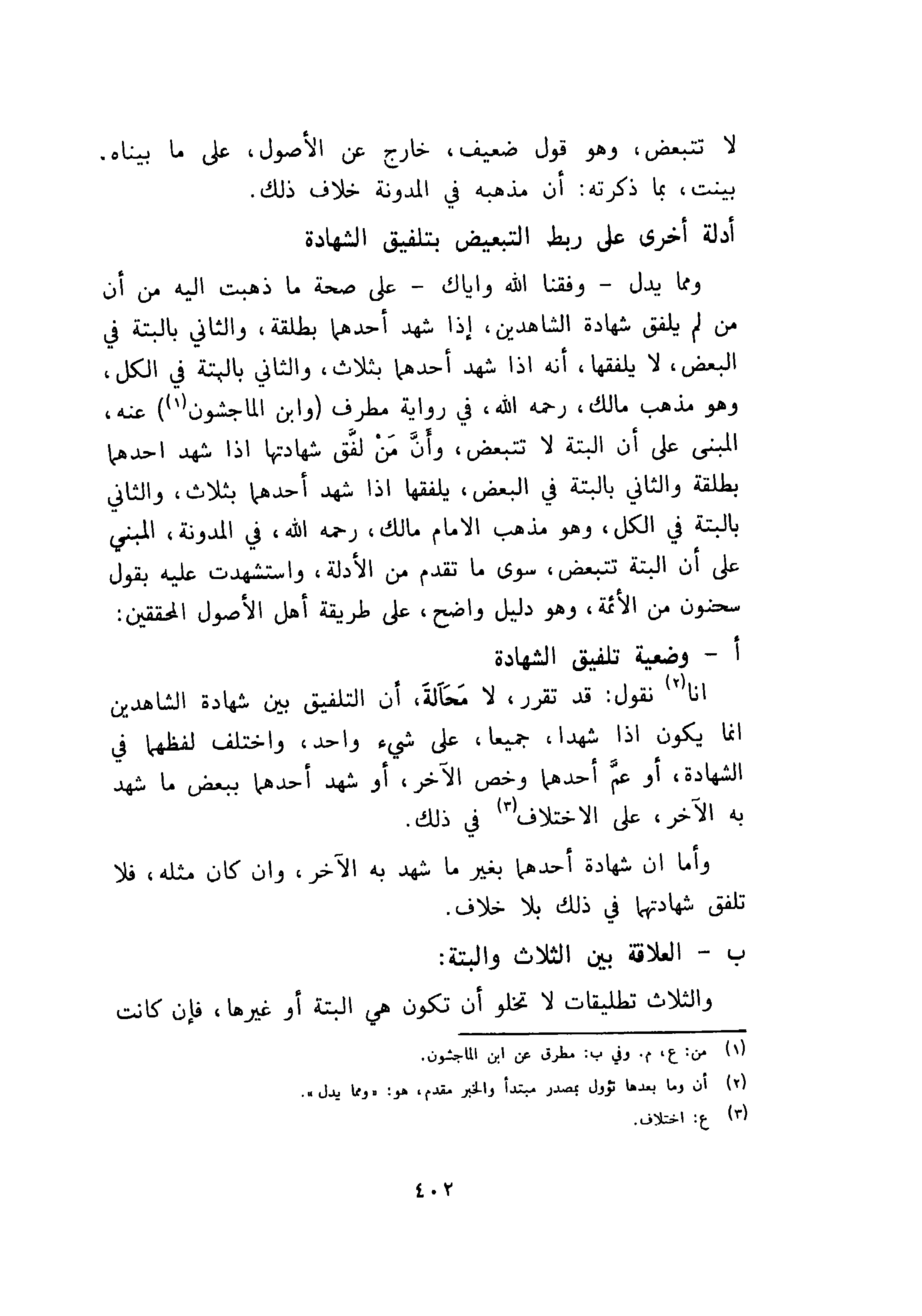 ومما يدل - وفقنا الله واياك - على صحة ما ذهبت اليه من أن من لم يلفق شهادة الشاهدين، إذا شهد أحدهما بطلقة، والثاني بالبتة في البعض، لا يلفقها، أنه إذا شهد أحدهما بثلاث، والثاني بالبتة في الكل، وهو مذهب مالك، ر حمه الله في رواية مطرف وابن الماجشون عنه المبنى على أن البتة لا تتبعض، وأن من لفق شهادتها إذا شهد احداهما بطلقة والثاني بالبتة في البعض، يلفقها إذا شهد أحدهما بثلاث، والثاني بالبتة في الكل، وهو مذهب الإمام مالك، رحمه الله، في المدونة، المبنى على أن البتة تتبعض، سوى ما تقدم من الادلة، واستشهدت عليه بقول سحنون من لالأثمة، وهو دليل واضح، على طريقة أهل الأصول المحققين: