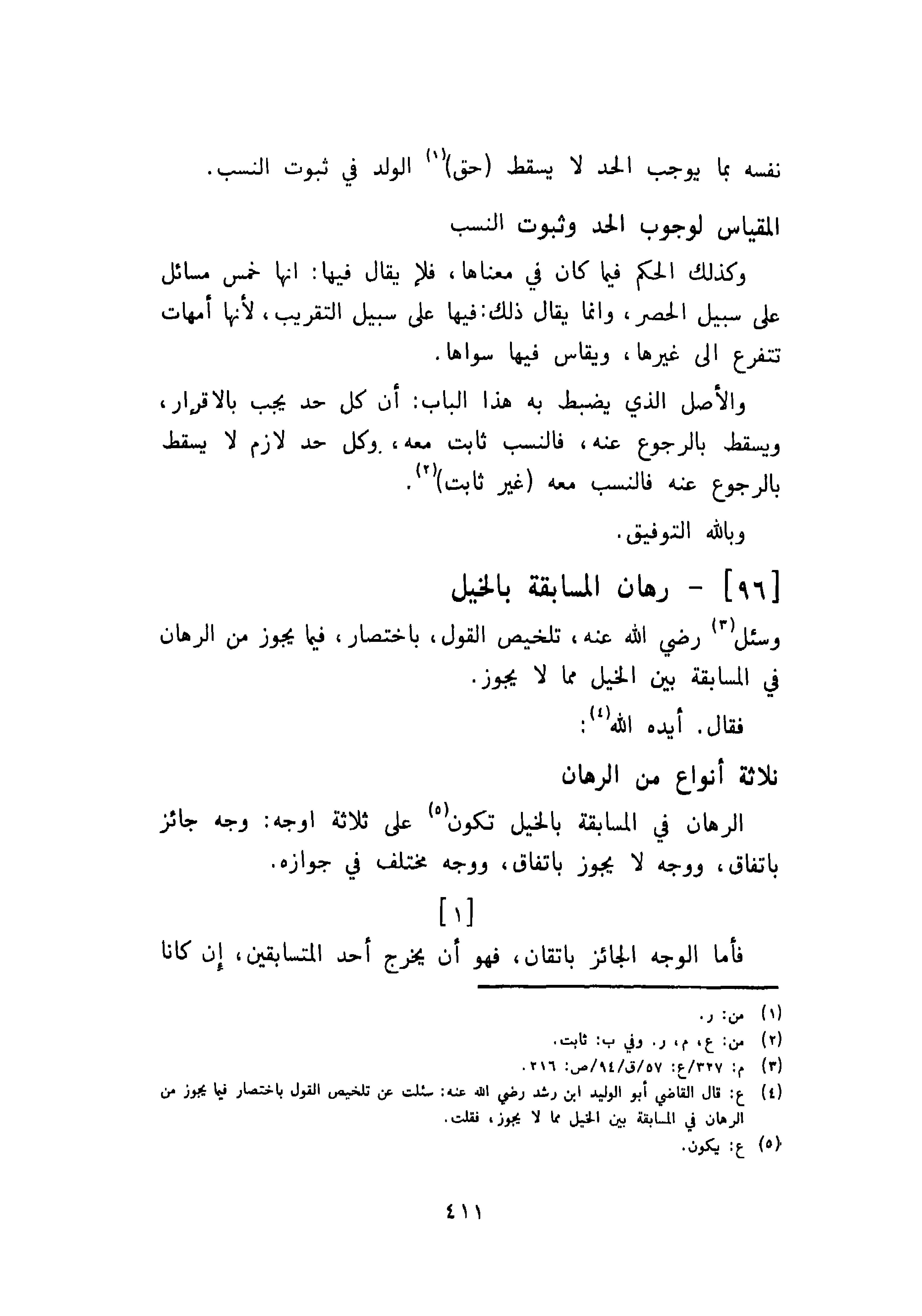 الرهان في المسابقة بالخيل تكون على ثلاثة اوجه: وجه جائز باتفاق، ووجه لا يجوز باتفاق، ووجه مختلف في جوازه.