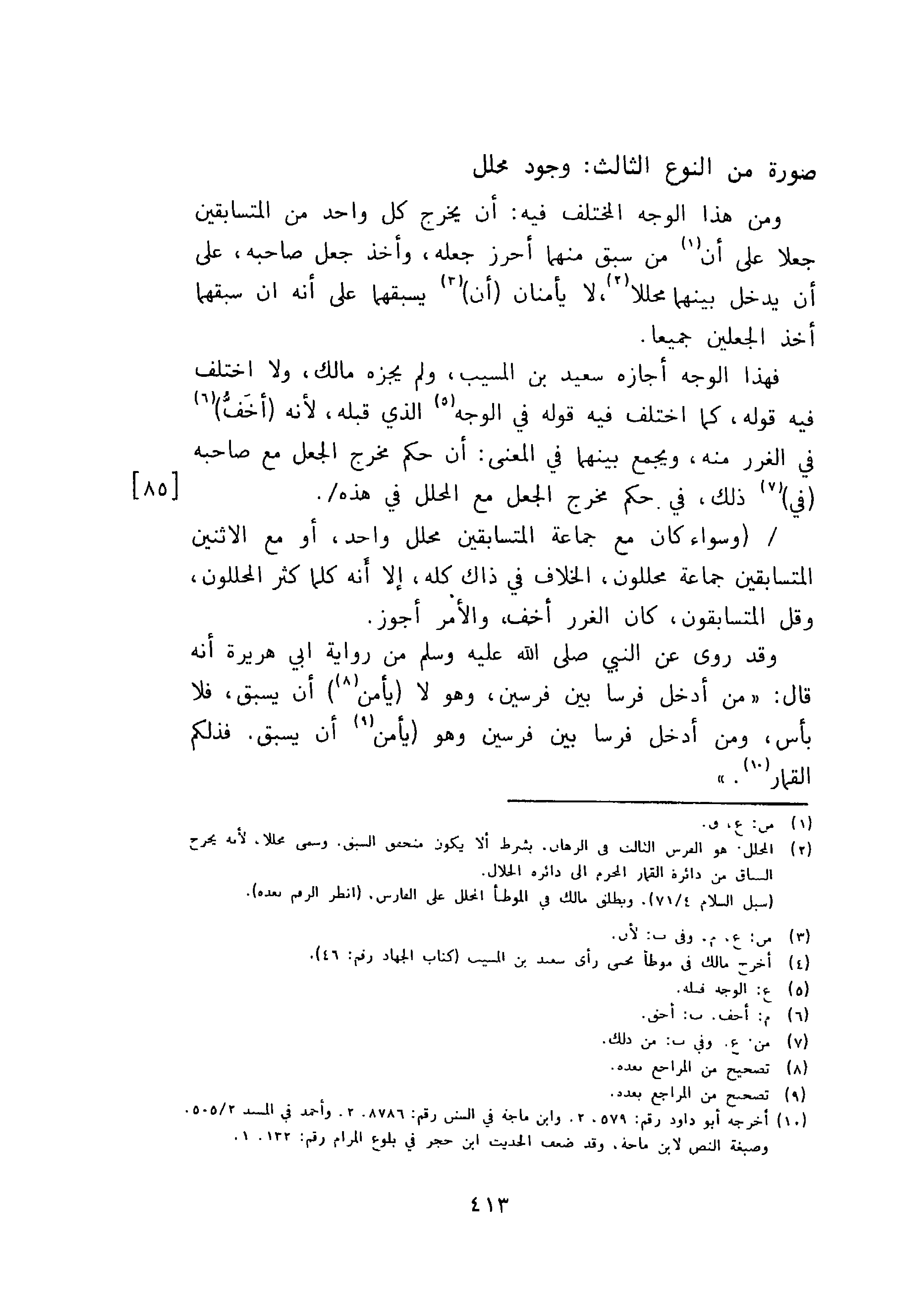ومن هذا الوجه المختلف فيه: أن يخرج كل واحد من المتسابقين جعلا على أن من سبق منهما أحرز جعله، وأخذ جعل صاحبه، على أن يدخل بينهما محللا لا يأمنان أن يسبقهما على أنه أن سبقهما أخذ الجعلين جميعا.