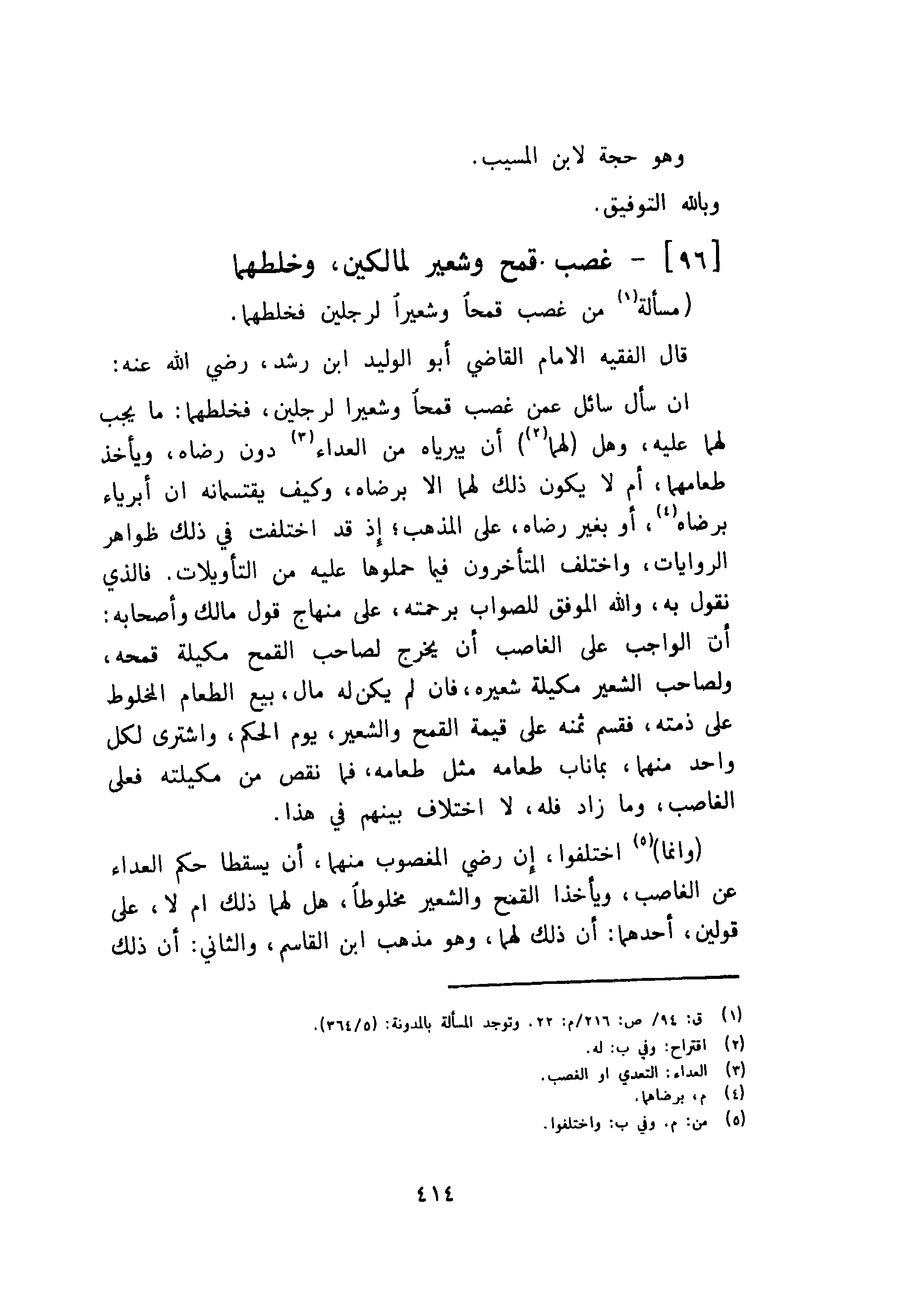 قال الفقيه الإمام القاضي أبو الوليد ابن رشد رضي الله عنه: ان سأل سائل عمن غصب قمحا وشعيرا لرجلين، فخلطهما: ما يجب لهما عليه، وهل لهما أن يبرياه من العداء دون رضاه، ويأخذ طعامهما، أم لا يكون ذلك لهما الا برضاه، وكيف يقتسمانه ان أبرياء برضاه أو بغير رضاه، على المذهب؛ إذ قد اختلفت في ذلك ظواهر الروايات، واختلف المتأخرون فيما حملوها عليه من التأويلات، فالذي نقول به والله الموفق للصواب برحمته، على منهاج قول مالك وأصحابه: أن الواجب على الغاصب أن يخرج لصاحب القمح مكيلة قمحه، ولصاحب الشعير مكيلة شعيرة، فان لم يكن له مال، بيع الطعام المخلوط على ذمته، فقسم ثمنه على قيمة القمح والشعير يوم الحكم، واشترى لكل واحد منهما بما ناب طعامه مثل طعامه، فما نقص من مكيلته فعلى الغاصب وما زاد فله، لا اختلاف بينهم في هذا.