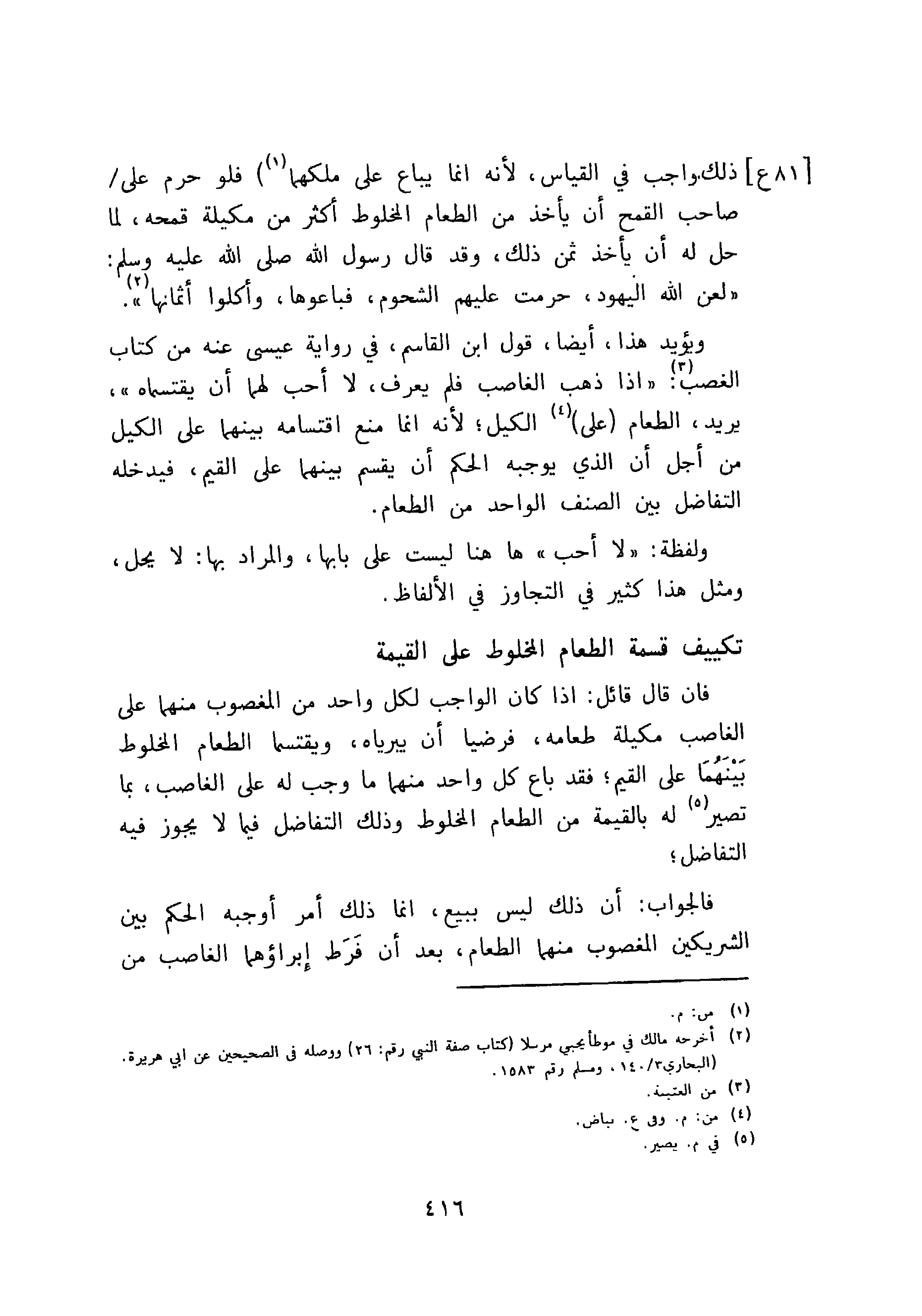 ويؤيد هذا، أيضا، قول ابن القاسم، في رواية عيسى من كتاب الغصب: إذا ذهب الغاصب فلم يعرف، لا أحب لهما أن يقتسماه يريد الطعام على الكيل؛ لأنه انما منع اقتسامه بينهما على الكيل من أجل ان الذي يوجبه الحكم أن يقسم بينهما على القيم، فيدخله التفاضل بين الصنف الواحد من الطعام.