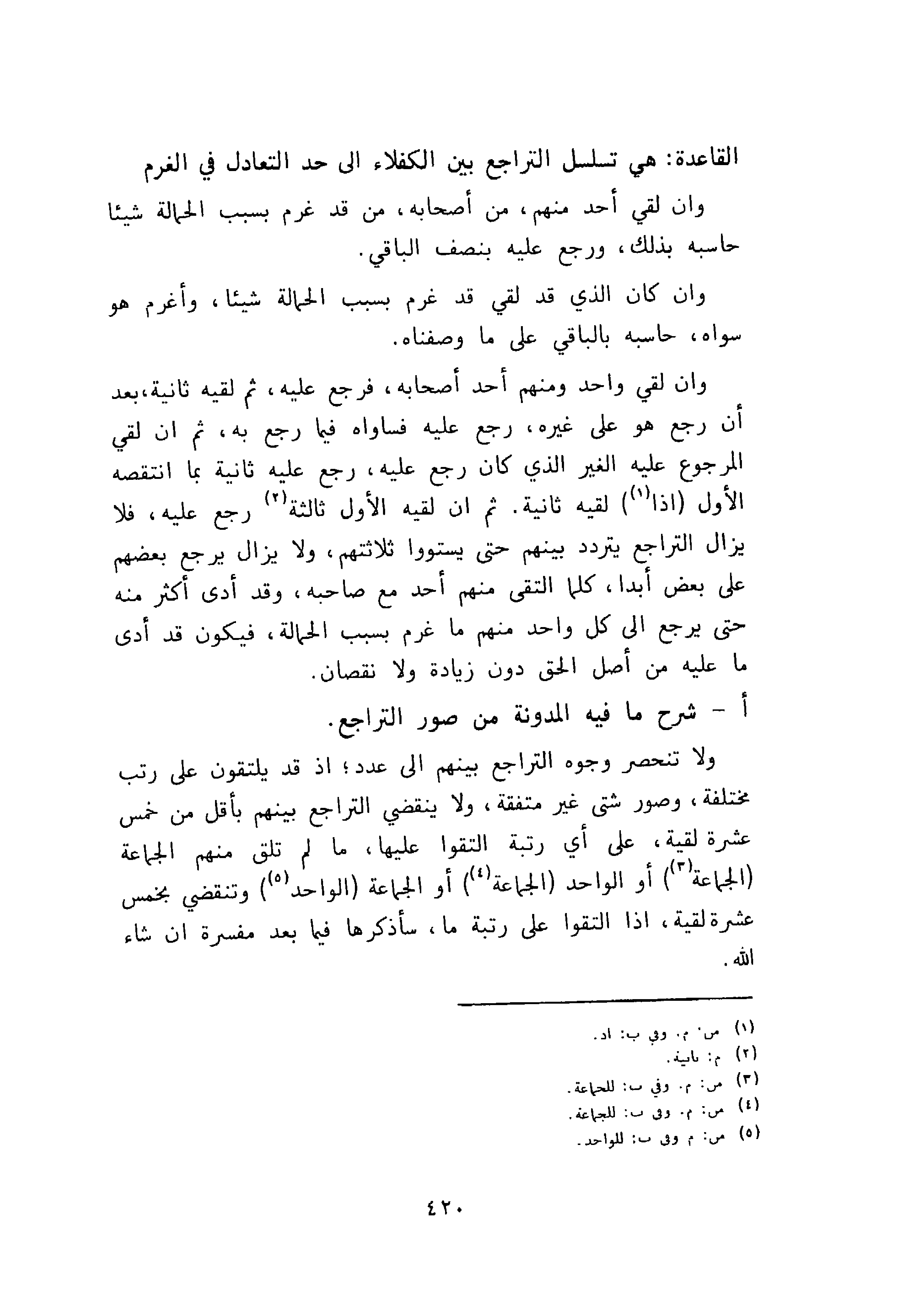 ولا تنحصر وجوه التراجع بينهم إلى عدد؛ اذ قد يلتقون على رتب مختلفة وصور شتى غير متفقة، ولا ينقضي التراجع بينهم بأقل من خمس عشرة لقية على أي رتبة التقوا عليها، ما لم تلق منهم الجماعة الجماعة أو الواحد الجماعة أو الجماعة الواحد وتنقضي بخمس عشرة لقية إذا التقوا على رتبة ما سأذكرها فيما بعد مفسرة ان شاء الله