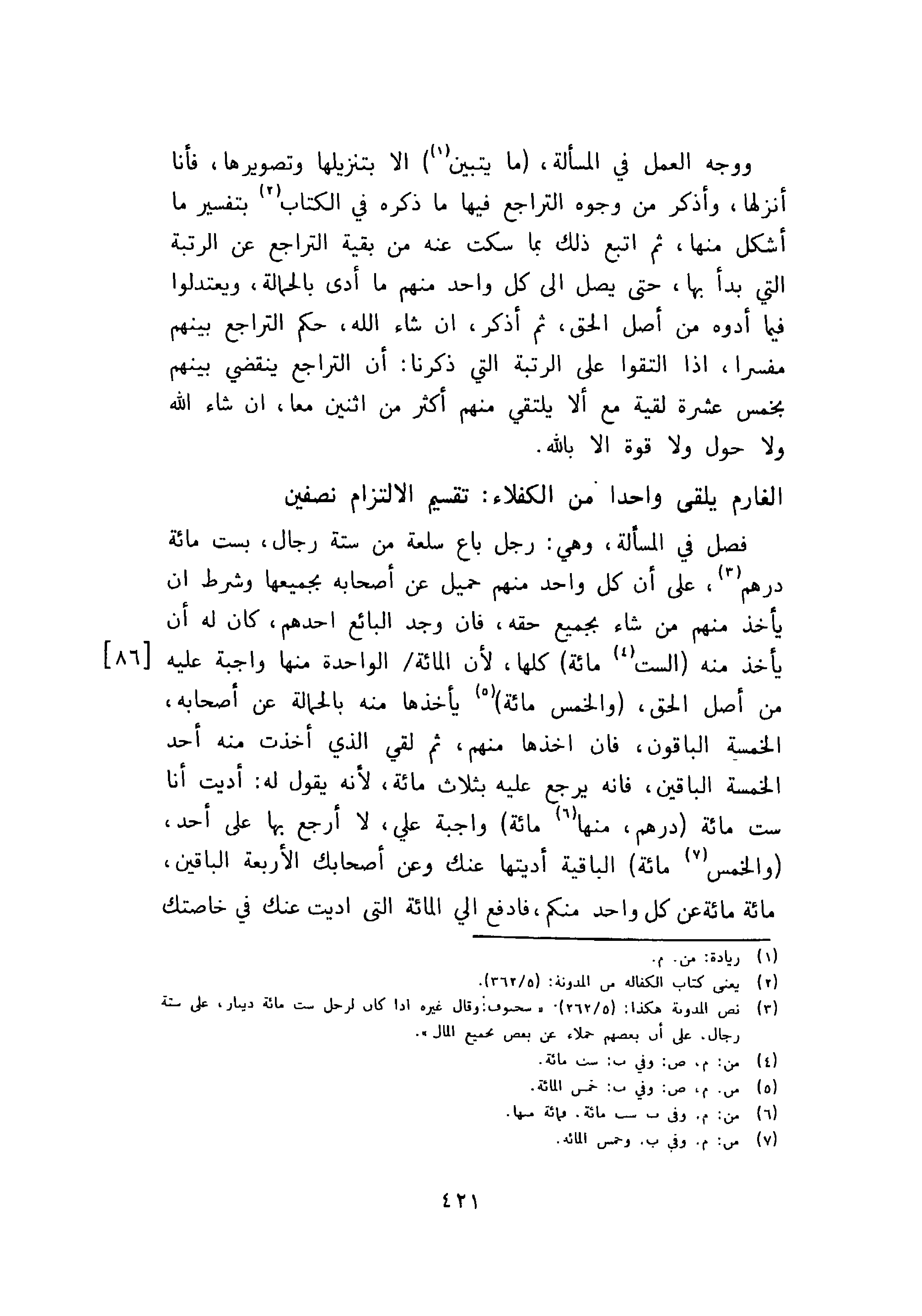 فصل في المسألة، وهى: رجل باع سلعة من ستة رجال، بست مائة درهم، على أن كل واحد منهم حميل عن أصحابه بجميعها وشرط ان يأخذ منهم من شاء بجميع حقه، فان وجد البائع احدهم، كان له ان يأخذ منه الست مائة كلها، لأن المائة / الواحدة منها واجبة عليه [86] من أصل الحق، والخمس مائة يأخذها منه بالحمالة عن أصحابه، الخمسة الباقون، فان اخذها منهم، ثم لقى الذى أخذت منه أحد الخمسة الباقين، فانه يرجع عليه بثلاث مائة، لأنه يقول له: أديت أنا ست مائة درهم منها مائة واجبة على، لا أرجع بها على أحد والخمس مائة الباقية أديتها عنك وعن أصحابك الاربعة الباقين، مائة مائة عن كل واحد منكم، فادفع إلى المائة التى عنك في خاصتك