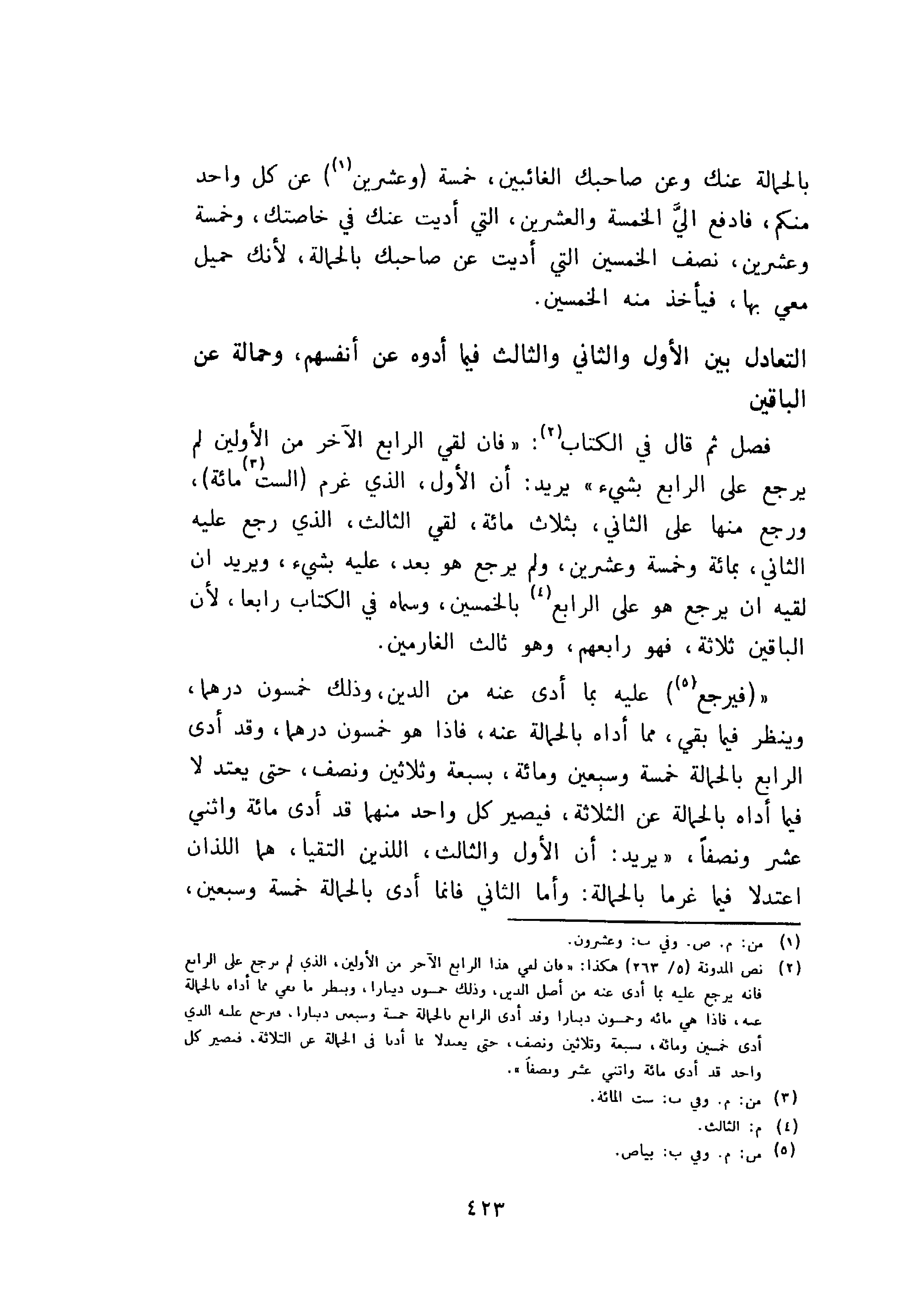 «فيرجع عليه بما أدى عنه من الدين، وذلك خمسون درهما، وينظر فيما بقى، مما أداة بالحمالة عنه فاذا هو خمسون درهما، وقد أدى الرابع بالخمالة خمسة وسبعين ومائة، بسبعة وثلاثين ونصف، حتى يعتد لا عشر ونصفا، «يريد: أن الأول والثالث، اللذين التقيا، هما اللذان اعتدلا فيما غرما بالحمالة: وأما الثانى فانما أدى بالحمالة خمسة وسبعين،