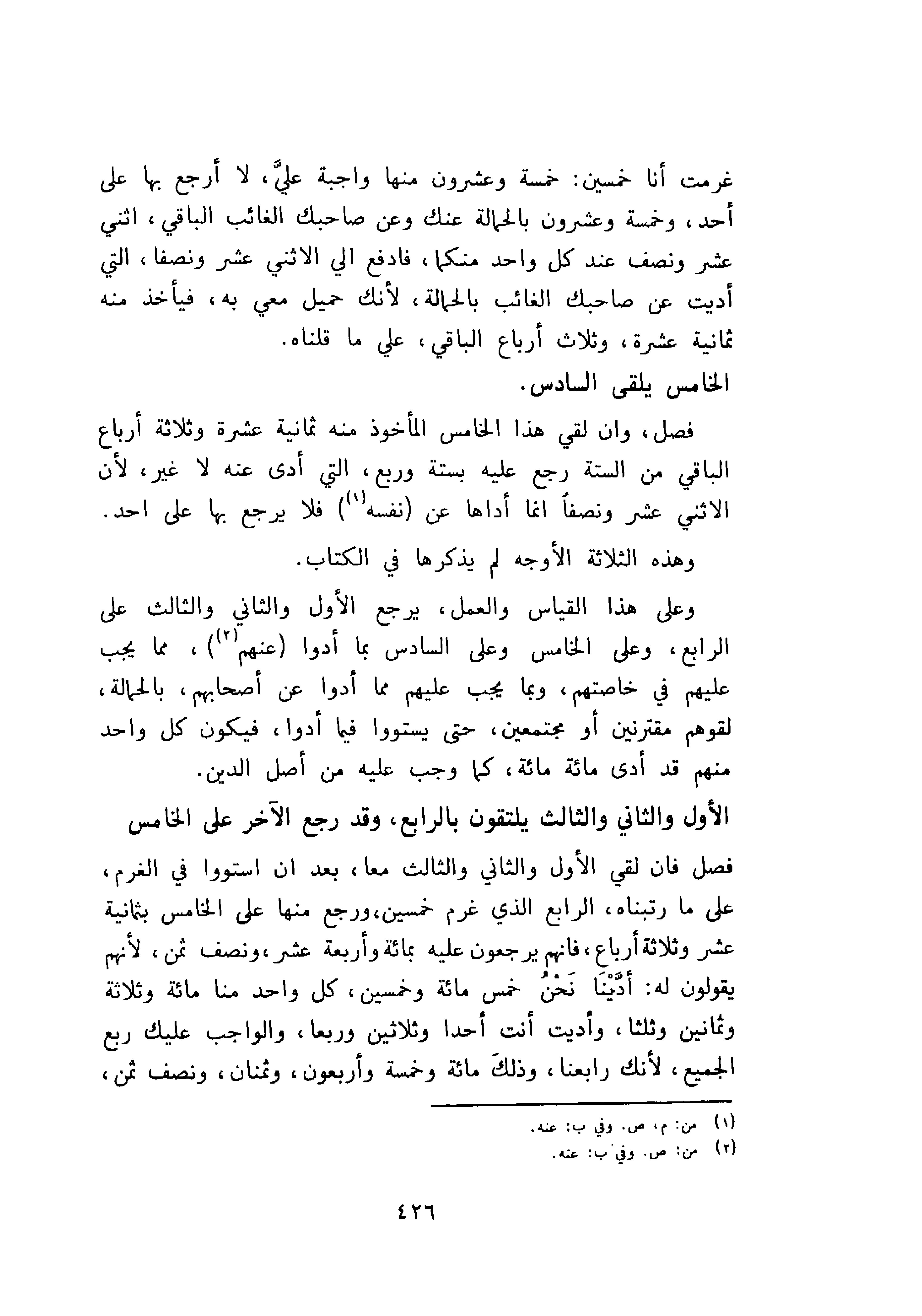 فصل، وان لقي هذا الخامس المأخوذ منه ثمانية عشرة وثلاثة أرباع الباقي من الستة رجع عليه بستة وربع التي أدى عنه لا غير، لأن الاثنى عشر ونصفا انما أداها عن نفسه فلا يرجع بها على احد.