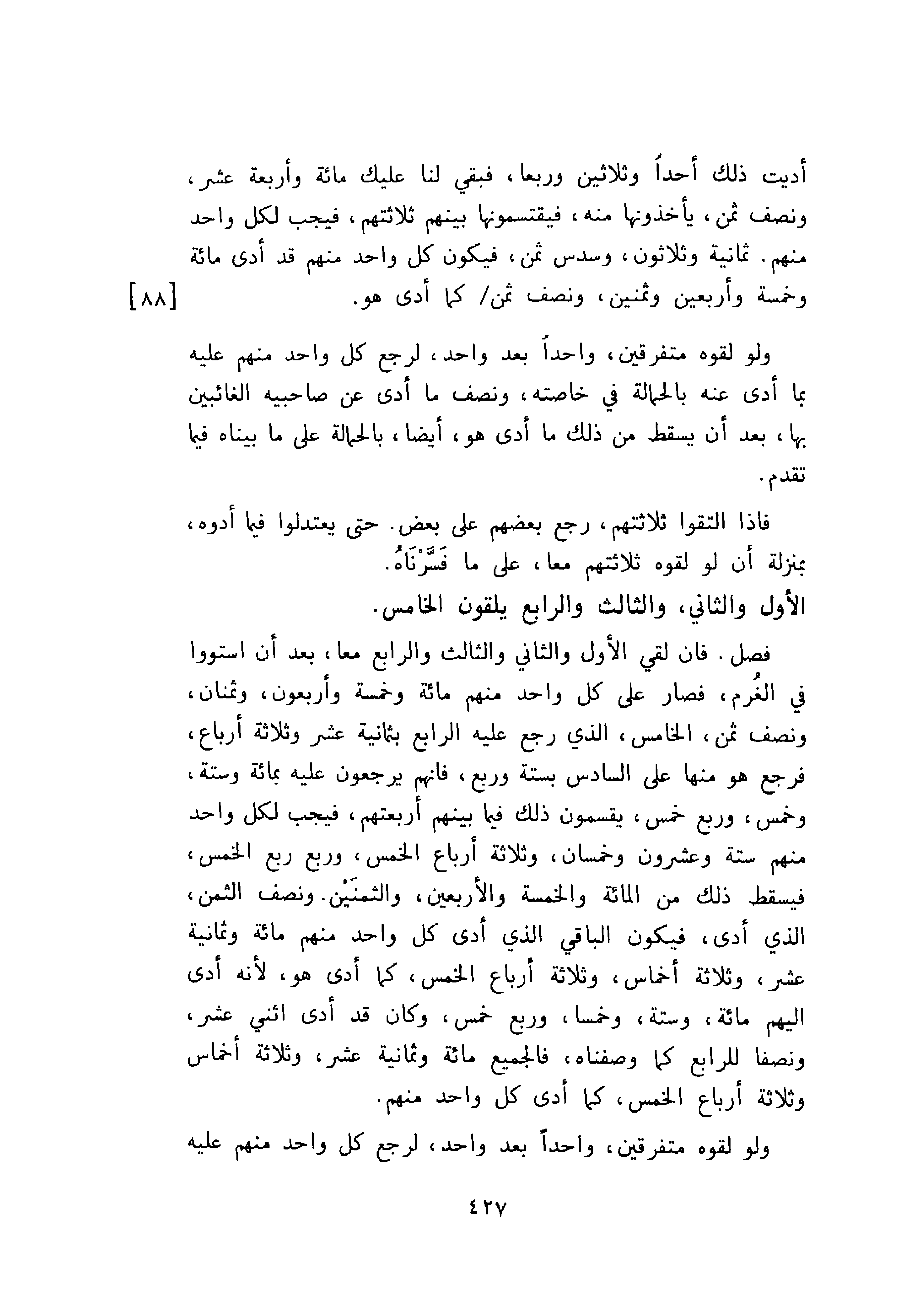 أديت ذلك أحدا وثلاثين وربعا فبقي لنا عليك مائة وأربعة عشر ونصف ثمن يأخذونها منه، فيقتسمونها بينهم ثلاثيهم، فيجب لكل واحد منهم ثمانية وثلاثون وسدس ثمن كل واحد منهم قد أدى مائة وخمسة وأربعين وثمنين، ونصف ثمن / كما أدى هو.