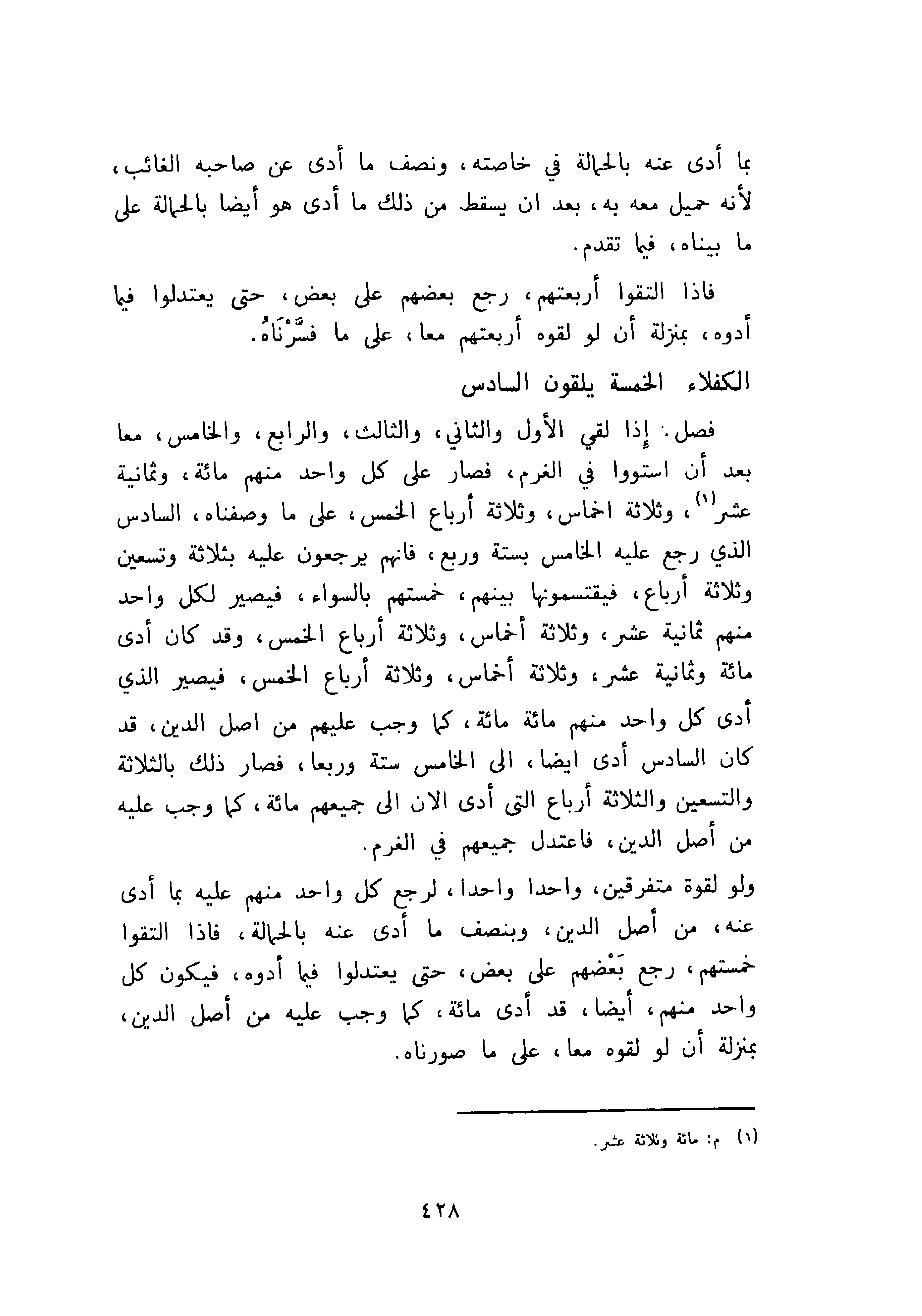 فصل. إذا لقي الأول والثاني والثالث، والرابع، والخامس، معا بعد أن استووا في الغرم، فصار على كل واحد منهم مائة، وثمانية عشر وثلاثة اخماس وثلاثة أرباع الخمس على ما وصفناه، السادس الذي رجع عليه الخامس بستة وربع، فانهم يرجعون عليه بثلاثة وتسعين وثلاثة أرباع، فيقتسمونها بينهم، خمستهم بالسواء، فيصير لكل واحد منهم ثمانية عشر، وثلاثة أخماس، وثلاثة أرباع الخمس وقد كان أدى مائة وثمانية عشر، وثلاثة أخماس وثلاثة أرباع الخمس، فيصير الذي أدى كل واحد منهم مائة مائة، كما وجب عليهم من أصل الدين، قد كان السادس أدى أيضا، إلى الخامس ستة وربعا، فصار ذلك بالثلاثة والتسعين والثلاثة أرباع التي أدى الان إلى جميعهم، كما وجب عليه من أصل الدين، فاعتدل جميعهم في الغرم.