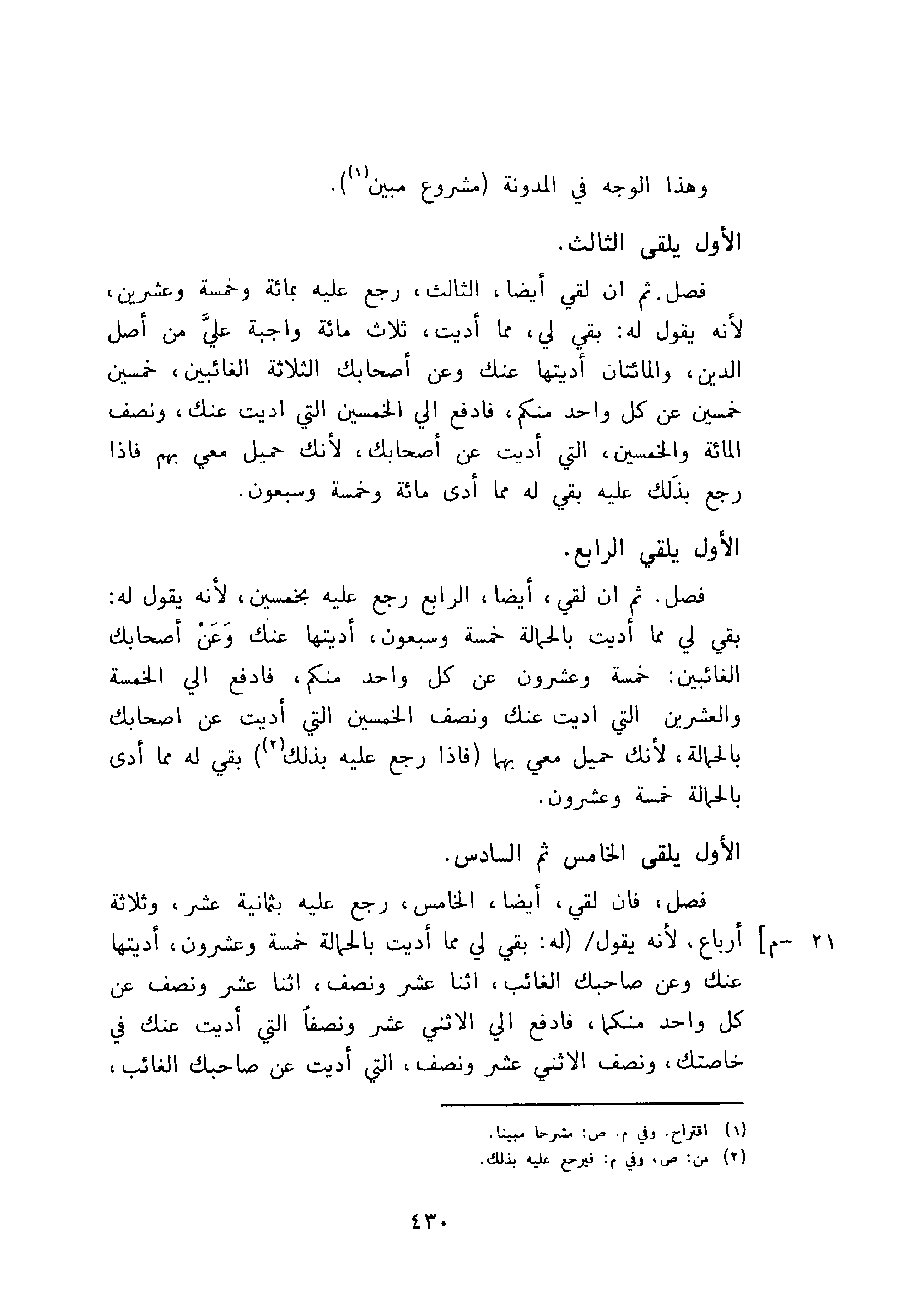 فصل، فان لقي، أيضا الخامس رجع عليه بثمانية عشر، وثلاثة أرباع، لأنه يقول له بقي لي مما أديت بالحمالة خمسة وعشرون، أديتها عنك وعن صاحبك الغائب، اثنا عشر ونصف، اثنا عشر ونصف عن كل واحد منكما، فادفع الي الاثني عشر ونصفا التي أديت عنك في خاصتك ونصف الاثني عشر ونصف، التي أديت عن صاحبك الغائب،