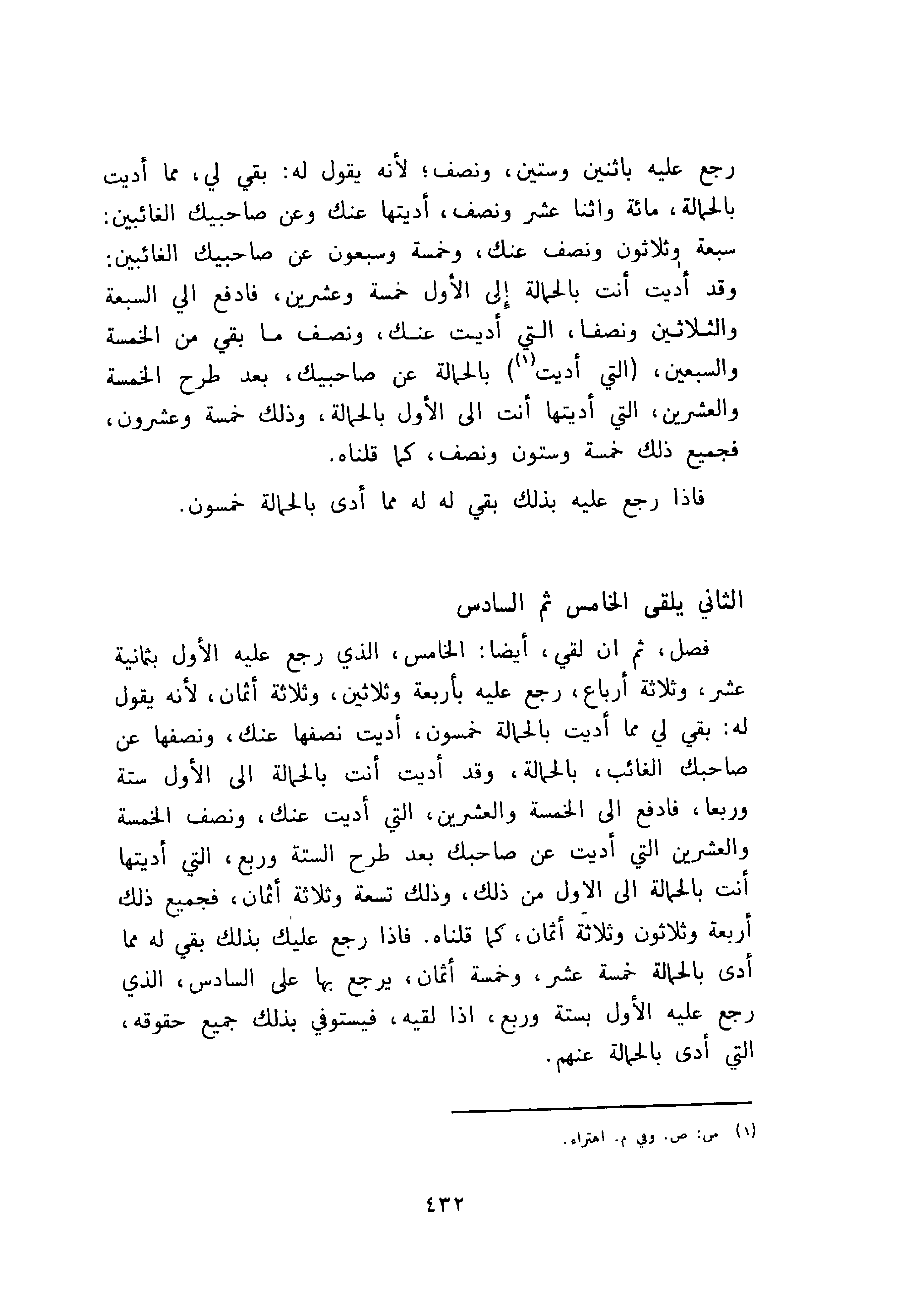 فصل، ثم ان لقي، أيضا الخامس، الذي رجع عليه الأول بثمانية عشر وثلاثة أرباع، رجع عليه بأربعة وثلاثين وثلاثة أثمان، لأنه يقول له: بقي لي مما أديت بالحمالة خمسون، أديت نصفها عنك، ونصفها عن صاحبك الغائب، بالحمالة وقد أديت أنت بالحمالة إلى الأول ستة وربعا، فادفع إلى الخمسة والعشرين، التي أديت عنك ونصف الخمسة والعشرين التي أديت عن صاحبك بعد طرح الستة وربع، التي أديتها أنت بالحمالة إلى الأول من ذلك، وذلك تسعة وثلاثة أثمان، فجميع ذلك أربعة وثلاثون وثلاثة أثمان، كما قلناه فاذا رجع عليك بذلك بقي له مما أدى بالحمالة خمسة عشر وخمسة أثمان، يرجع بها على السادس، الذي رجع عليه الأول بستة وربع، إذا لقيه، فيستوفي بذلك جميع حقوقه، التي أدى بالحمالة عنهم.
