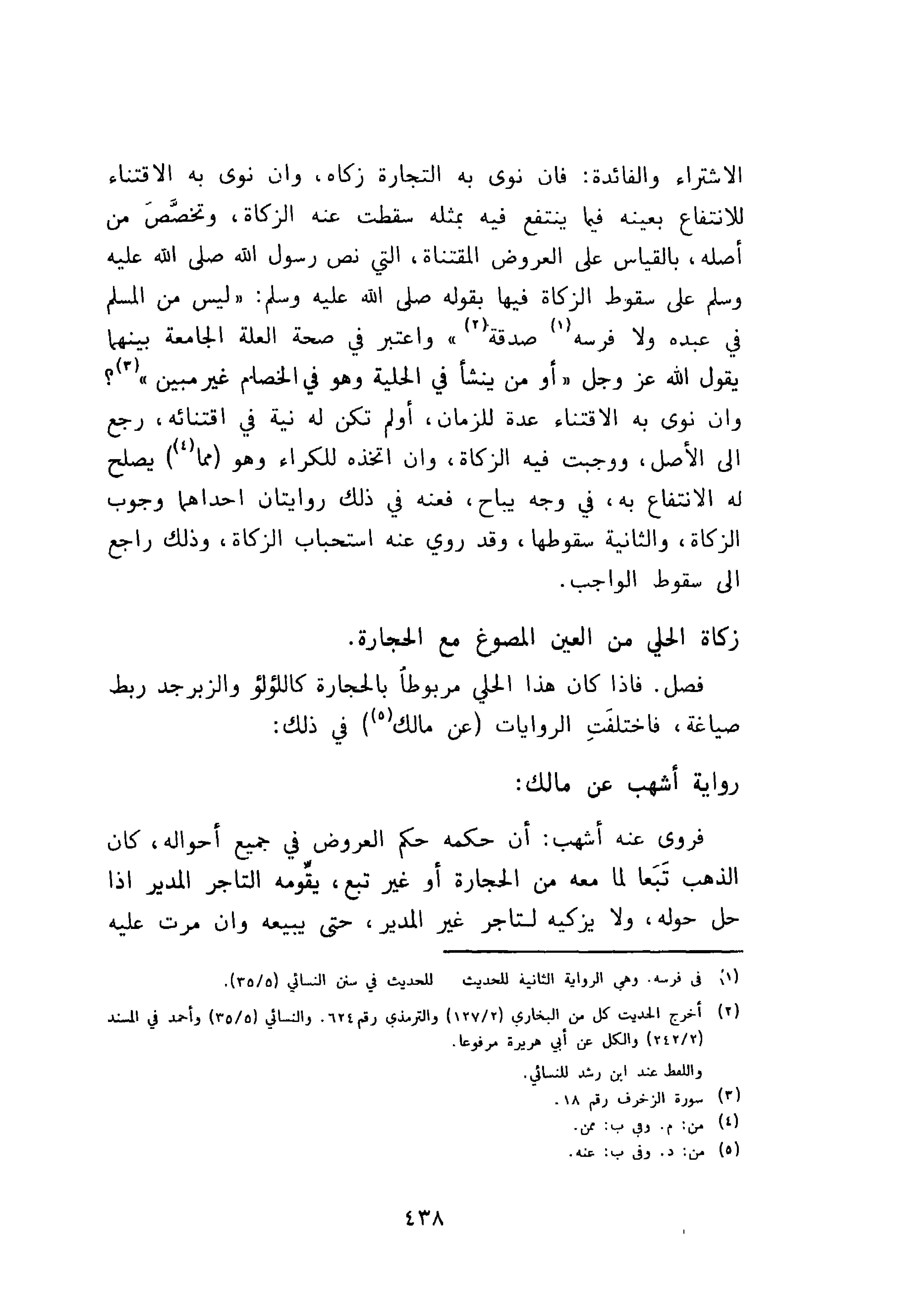 الاشتراء والفائدة: فان نوى به التجارة زكاة وان نوى به الاقتناء للانتفاع بعينه فيما تنتفع فيه بمثله سقطت عنه الزكاة، وتخصص من أصله بالقياس على العروض المقتناه، التي نص رسول الله صلى الله عليه وسلم على سقوط الزكاة فيها بقوله صلى الله عليه وسلم: " ليس من المسلم في عبده ولا فرسه صدقة " واعتبر في صحة العلة الجامعة بينهما يقول الله عز وجل {أو من ينشأ في الحلية وهو في الخصام غير مبين}