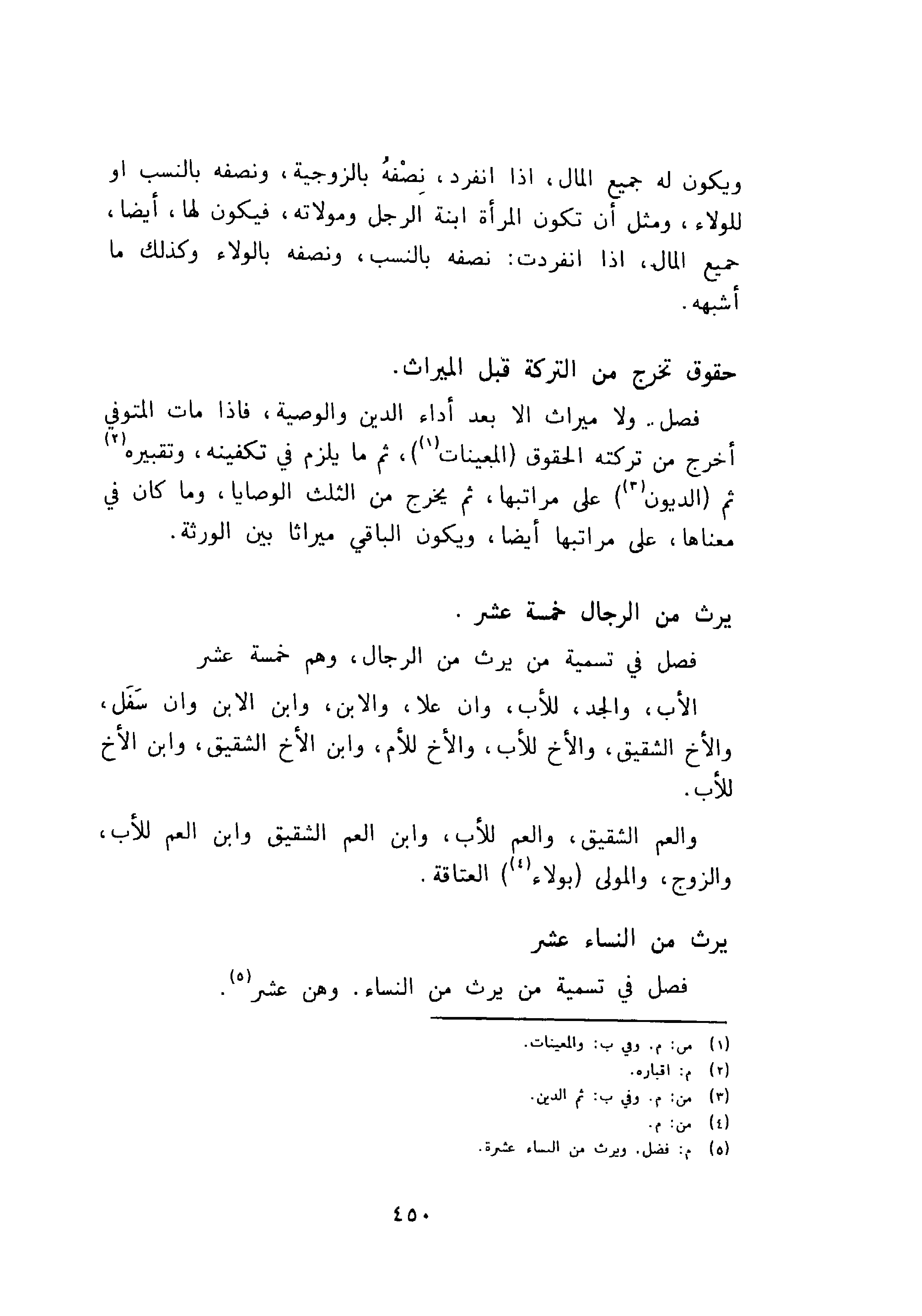 فصل. ولا ميراث الا بعد أداء الدين والوصية، فاذا مات المتوفي أخرج من تركته الحقوق المعينات، ثم ما يلزم في تكفينه، وتقبيره ثم الديون على مراتبها، ثم يخرج من الثلث الوصايا، وما كان في معناها، على مراتبها أيضا، ويكون الباقي ميراثا بين الورثة.