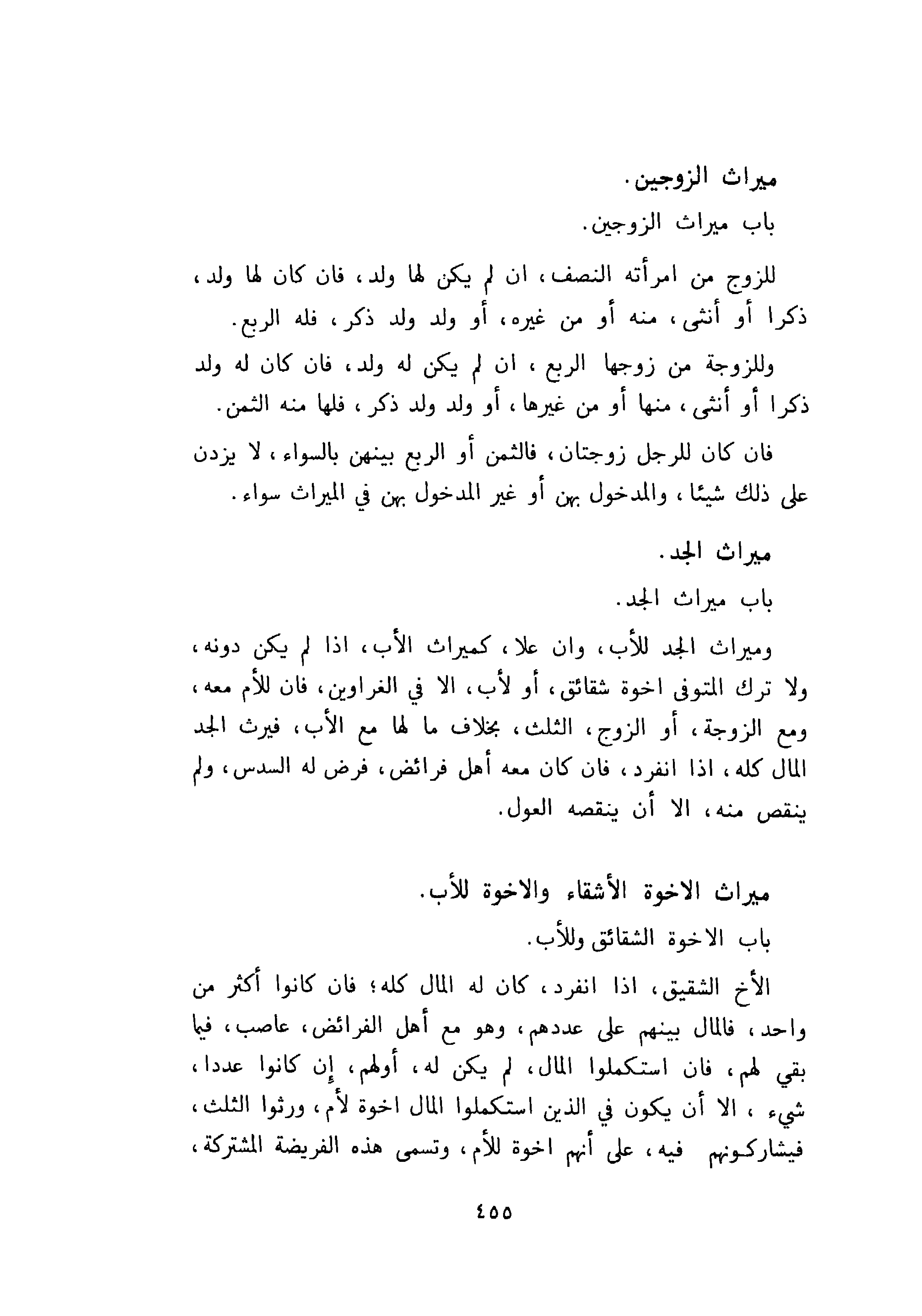 وميراث الجد للأب، وان علا كميراث الأب، إذا لم يكن دونه ولا ترك المتوفى إخوة شقائق، أو لأب، الا في الغراوين، فان للأم معه ومع الزوجة، أو الزوج الثلث، بخلاف ما لها مع الأب، فيرث الجد المال كله، إذا انفرد، فان كان معه أهل فرائض، فرض له السدس، ولم ينقص منه، الا أن ينقصه العول.