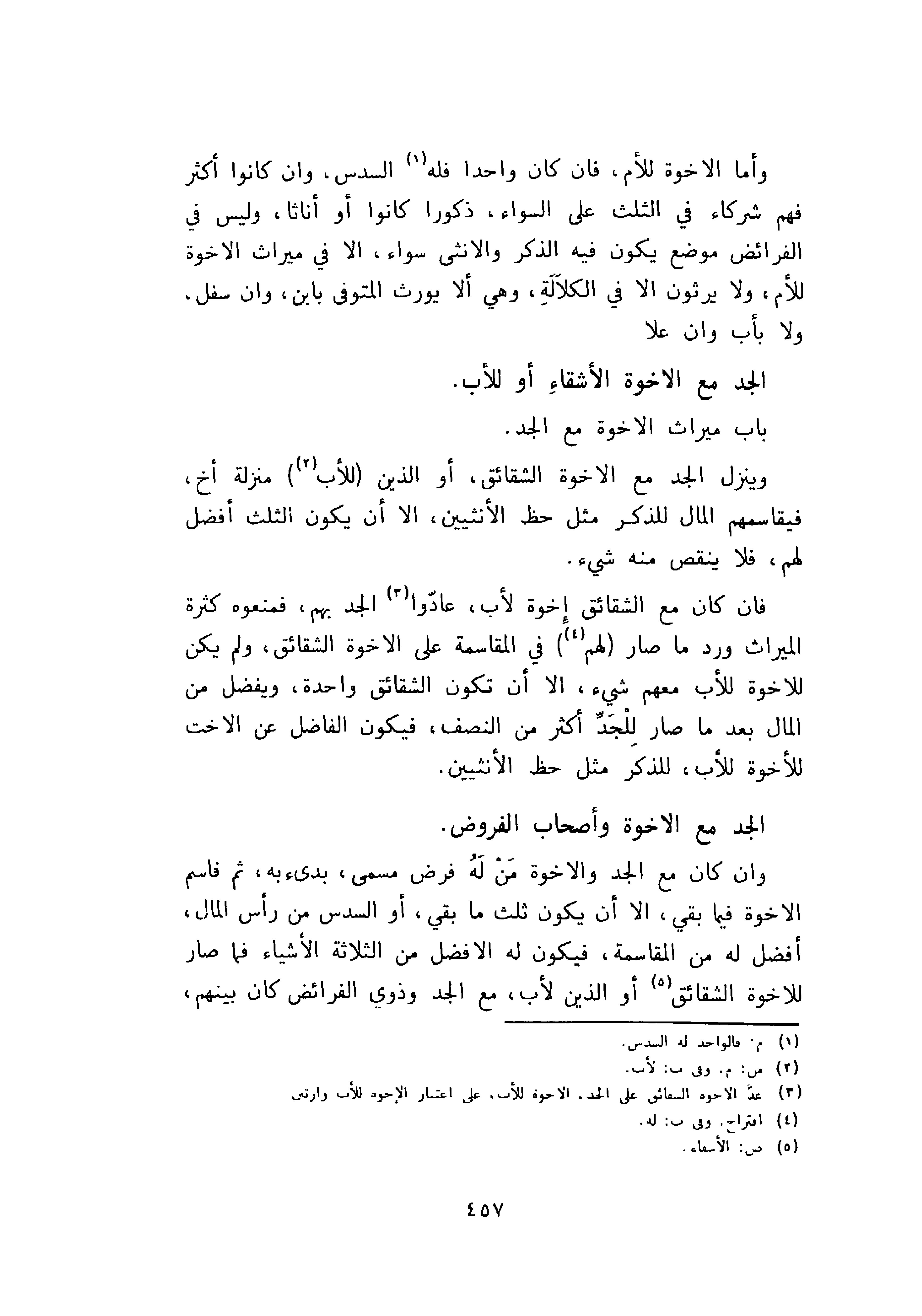 وان كان مع الجد والاخوة من له فرض مسمى، بدىء به، ثم قاسم الاخوة فيما بقي، الا أن يكون ثلث ما بقي، أو السدس من رأس المال، أفضل له من المقاسمة، فيكون له الافضل من الثلاثة الأشياء فما صار للأخوة الشقائق أو الذين لأب، مع الجد وذوى الفرائض كان بينهم،