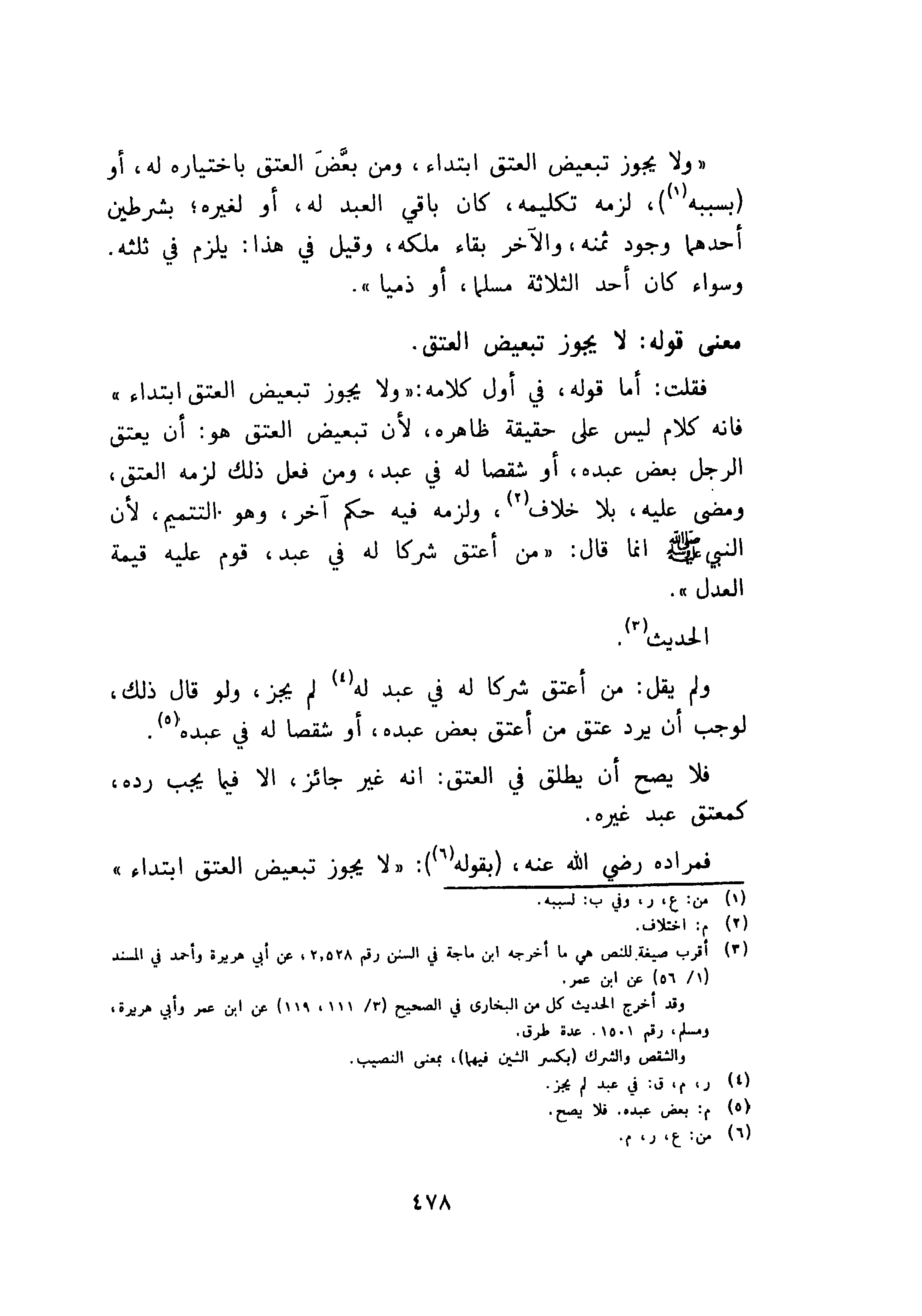«ولا يجوز تبعيض العتق ابتداء، ومن بعض العتق باختياره له، أو بسببه، لزمه تكليمه، كان باقى العبد له، أو لغيره؛ بشرطين أحدهما وجود ثمنه، والآخر بقاء ملكه، وقيل في هذا: يلزم في ثلثه. وسواء كان أحد الثلاثة مسلما، أو ذميا».