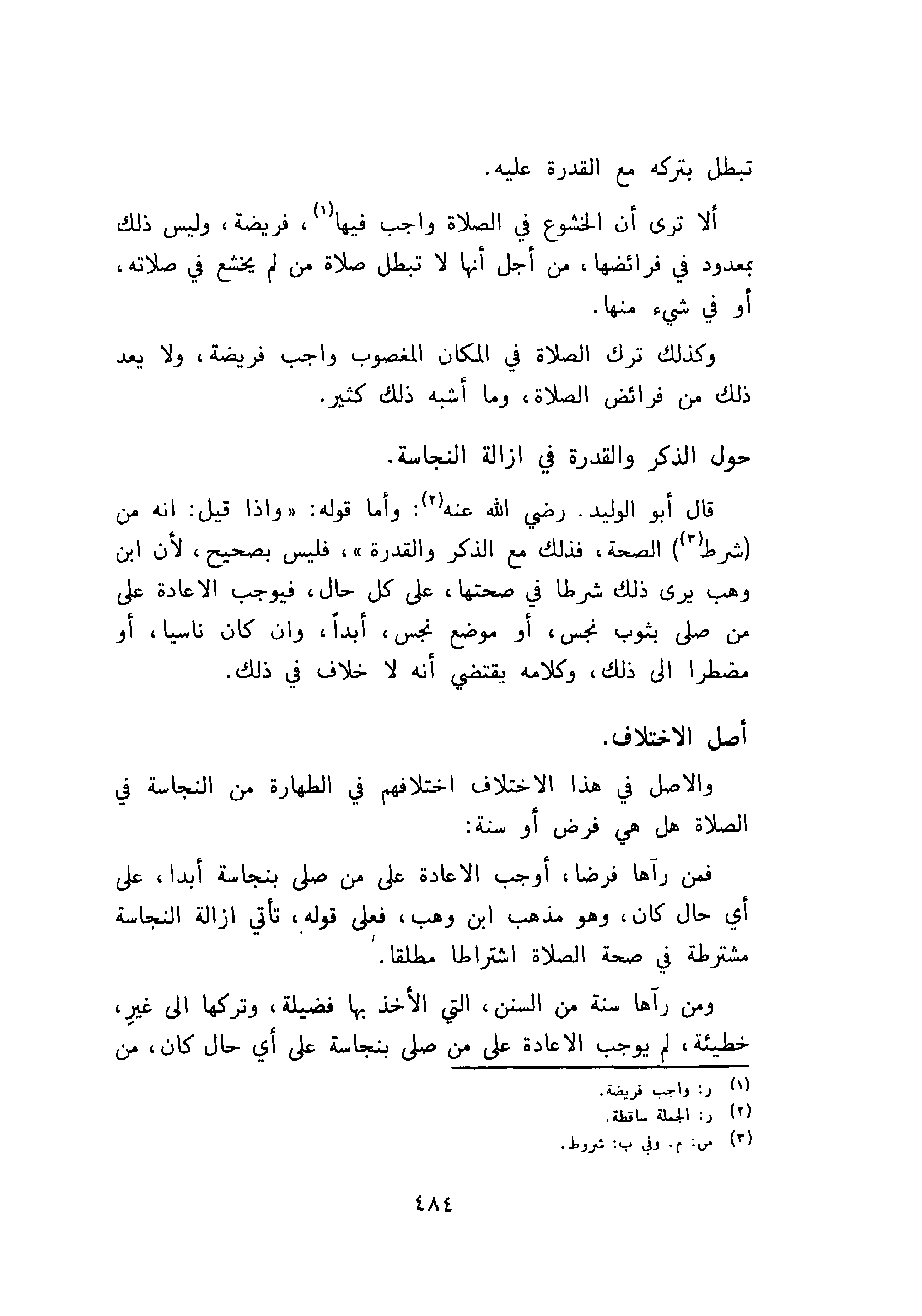 قال أبو الوليد رضي الله عنه: وأما قوله: واذا قيل: انه من شرط الصحة، فذلك مع الذكر والقدرة، فليس بصحيح، لأن ابن وهب يرى ذلك شرطا في صحتها، على كل حال، فيوجب الاعادة على من صلى بثوب نجس، أو موضع نجس، أبدا وان كان ناسيا، أو مضطرا إلى ذلك، وكلامه يقتضي أنه لا خلاف في ذلك.