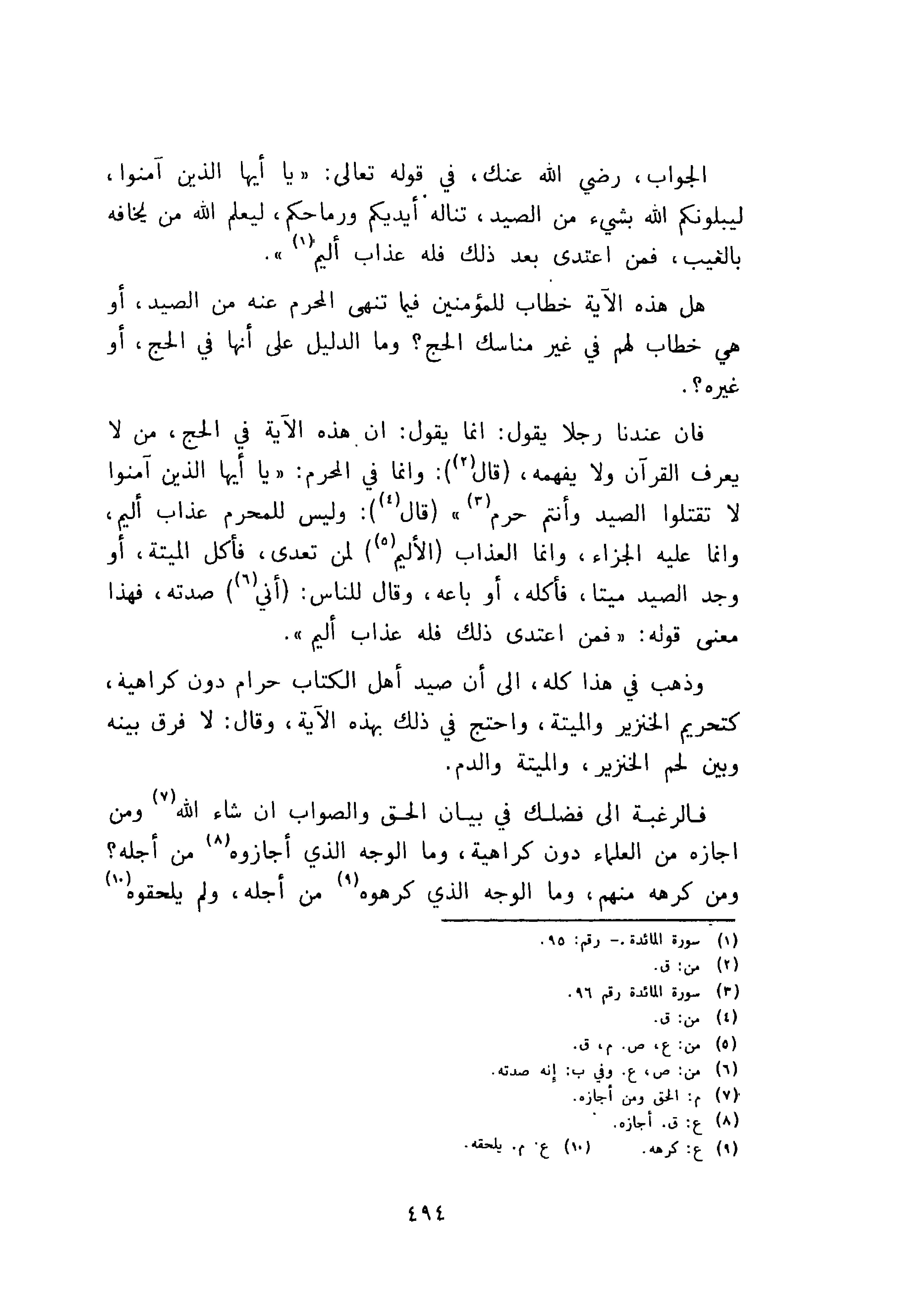 فالرغبة إلى فضلك في بيان الحق والصواب ان شاء الله ومن اجازه من العلماء دون كراهية، وما الوجه الذي أجازوه من أجله؟ ومن كرهه منهم وما الوجه الذي كرهوه من أجله، ولم يلحقوه