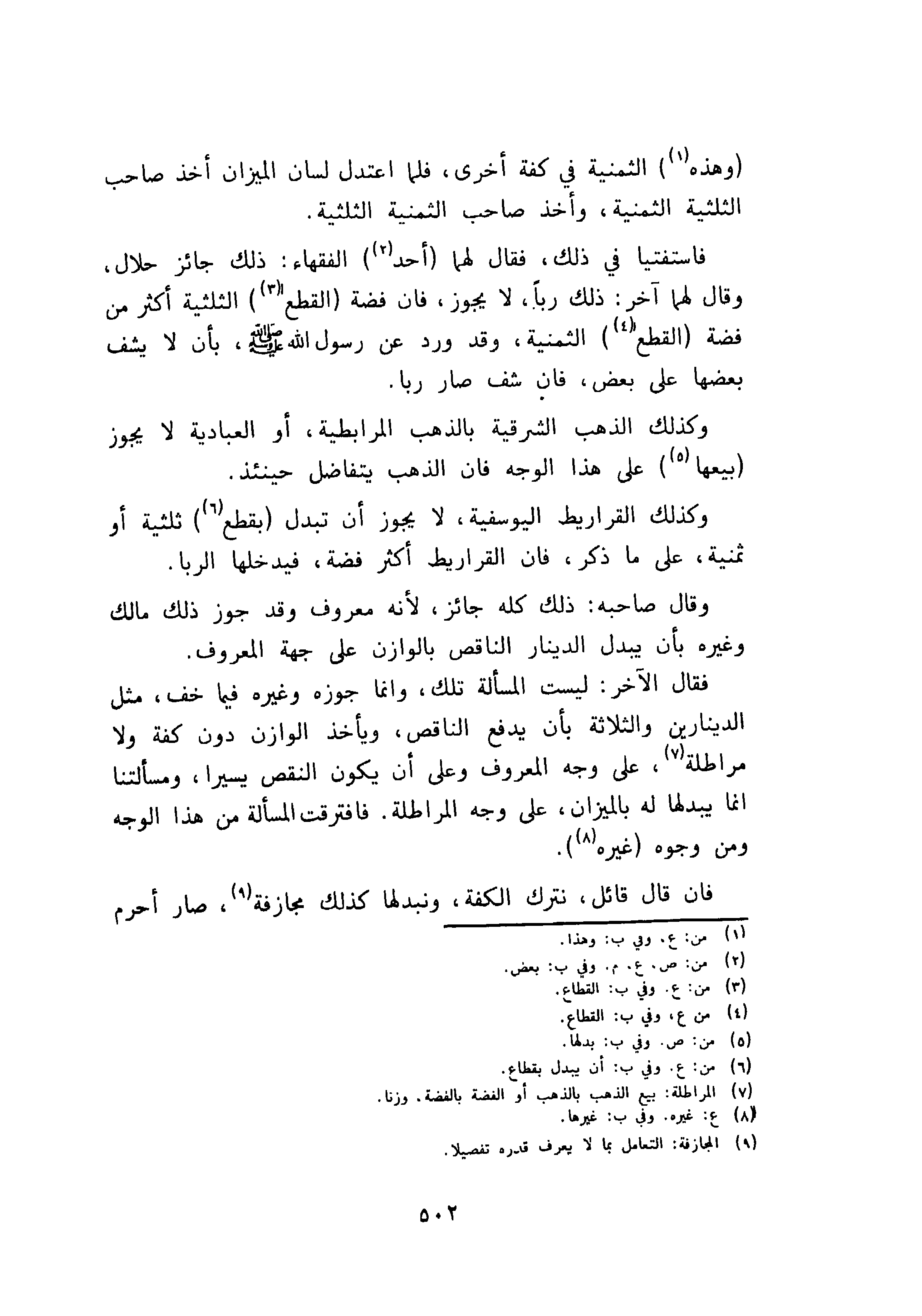 فاستفتيا في ذلك، فقال لهما أحد الفقهاء: ذلك جائز حلال وقال لهما آخر: ذلك ربا، لا يجوز، فان فضة القطع الثلثية أكثر من فضة القطع الثمنية، وقد ورد عن رسول الله صلى الله عليه وسلم، بأن لا يشف بعضها على بعض، فان شف صار ربا.
