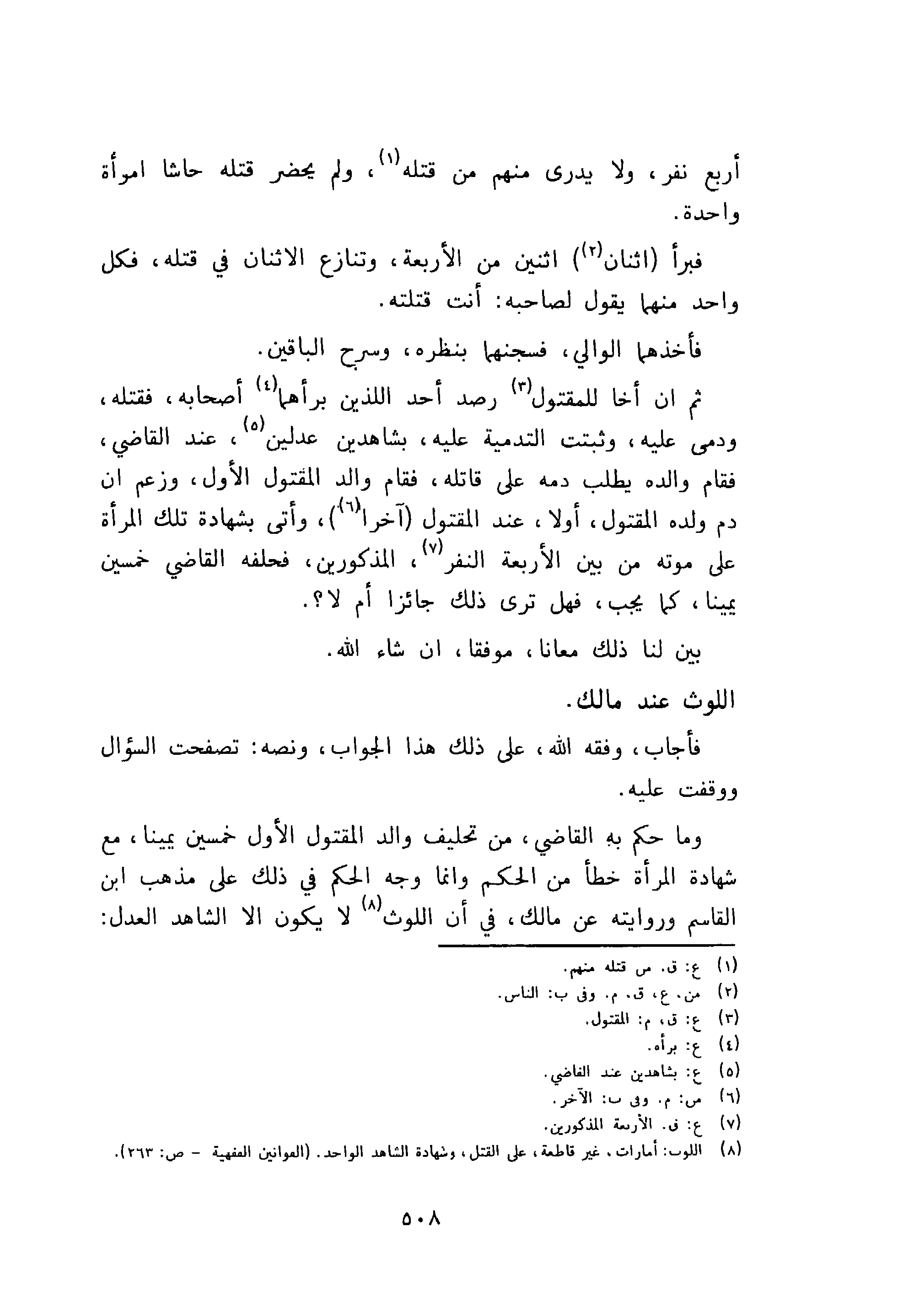وما حكم به القاضي، من تحليف والد المقتول الأول خمسين يمينا، مع شهادة المرأة خطأ من الحكم وانما وجه الحكم في ذلك على مذهب ابن القاسم وروايته عن مالك، في أن اللوث لا يكون الا الشاهد العدل: