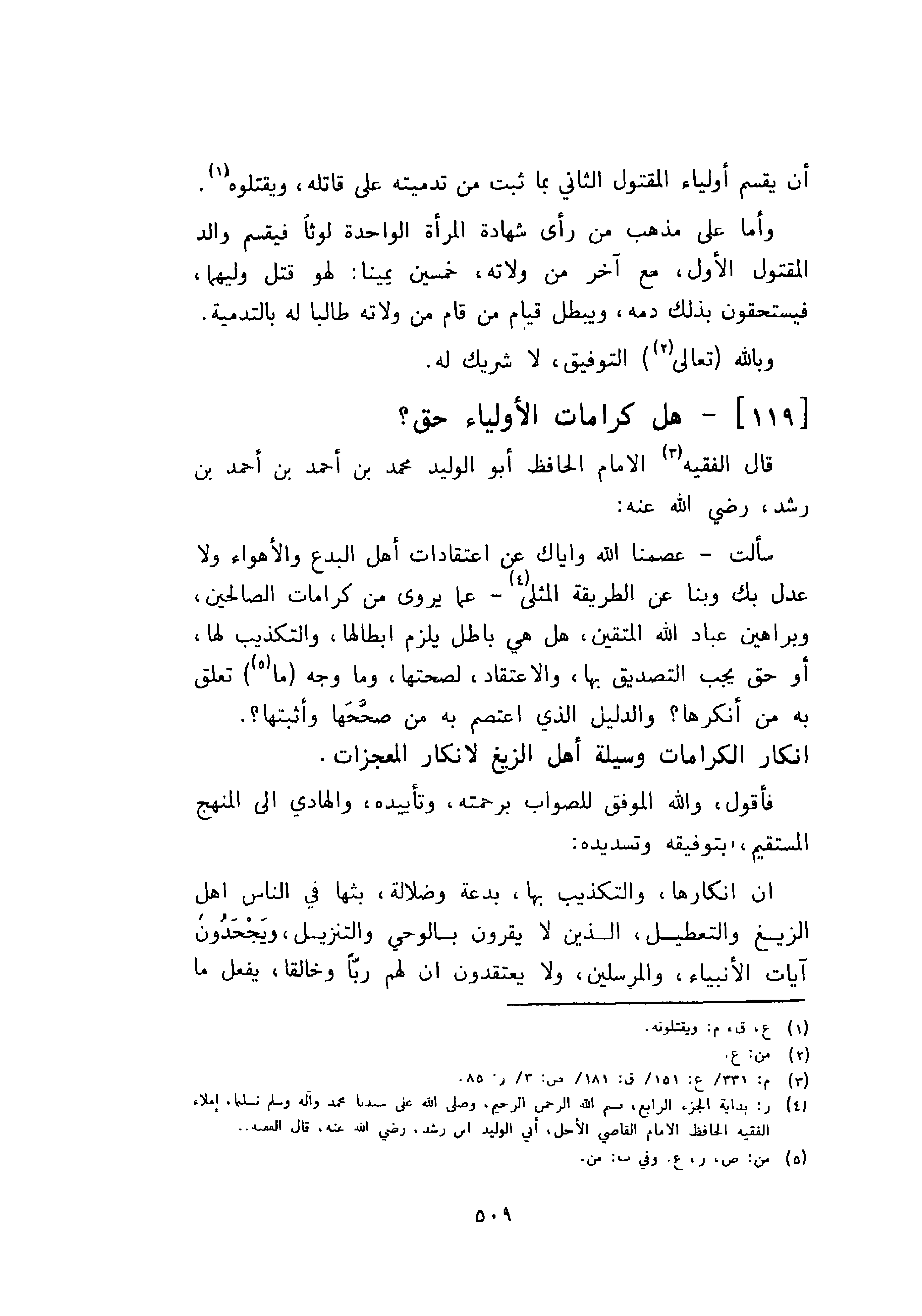 قال الفقيه الإمام الحافظ أبو الوليد محمد بن أحمد بن أحمد بن رشد، رضي الله عنه سألت - عصمنا الله واياك عن اعتقادات أهل البدع والأهواء ولا عدل بك وبنا عن الطريقة المثلى – عما يروى من كرامات الصالحين، وبراهين عباد الله المتقين، هل هي باطل يلزم ابطالها، والتكذيب لها، أو حق يجب التصديق بها، والاعتقاد، لصحتها، وما وجه ما تعلق به من أنكرها؟ والدليل الذي اعتصم به صححها وأثبتها؟