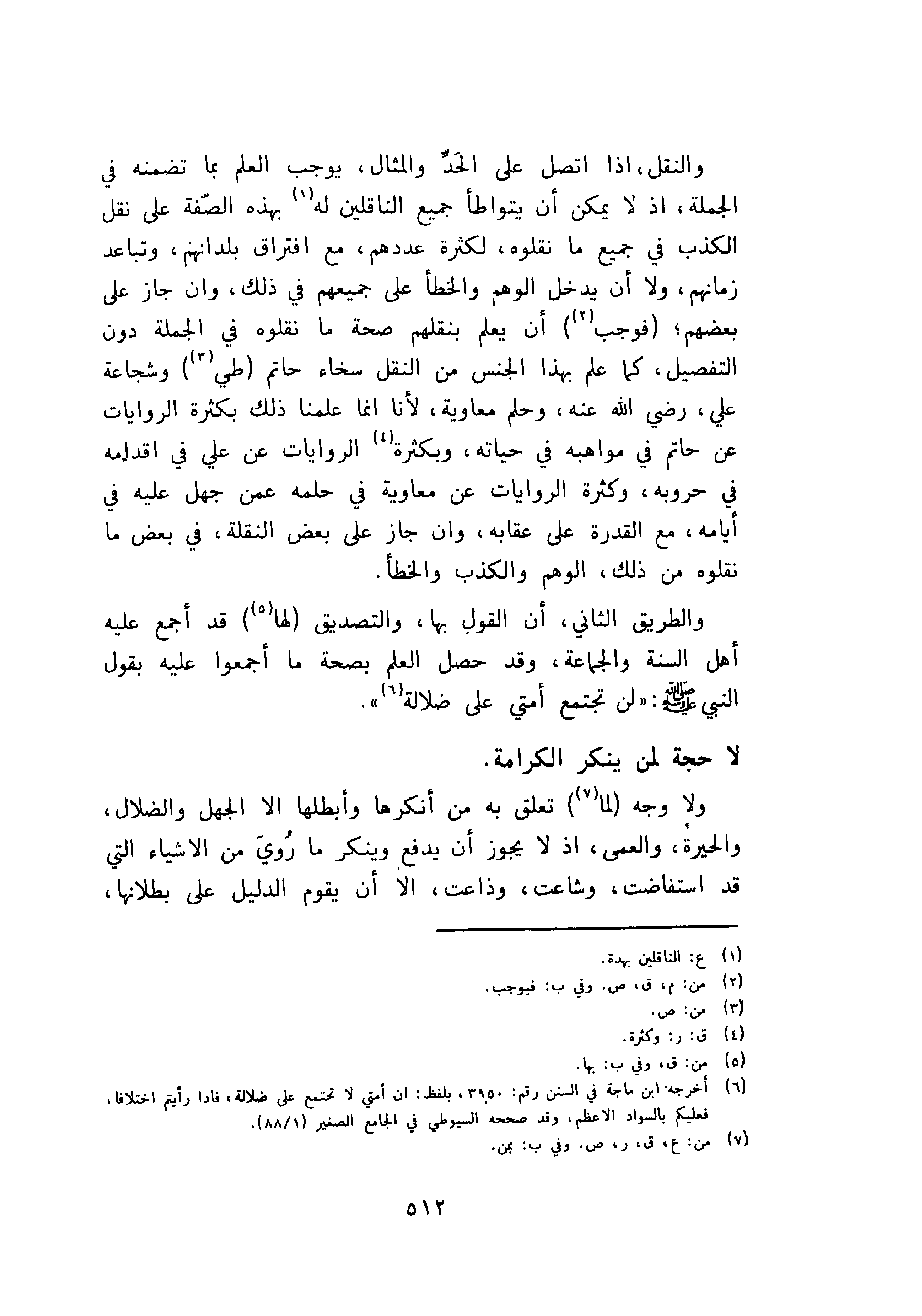 والنقل، إذا اتصل على الحد والمثال، يوجب العلم بما تضمنه في الجملة، اذ لا يمكن أن يتوطأ جميع الناقلين له بهذه الصفة على نقل الكذب في جميع ما نقلوه، لكثرة عددهم، مع افتراق بلدانهم، وتباعد زمانهم، ولا أن يدخل الوهم والخطأ على جميعهم في ذلك، وان جاز على بعضهم، ولا أن يدخل الوهم والخطأ على جميعهم في ذلك، وان جاز على بعضهم؛ فوجب أن يعلم بنقلهم صحة ما نقلوه في الجملة دون التفصيل، كما علم بهذا الجنس من النقل سخاء حاتم طي وشجاعة على، رضي الله عنه، وحلم معاوية، لأنا انما علمنا ذلك بكثرة الروايات عن حاتم في مواهبه في حياته، وبكثرة الروايات عن على في اقدامه في حروبه، وكثرة الروايات عن معاوية في حلمه عمن جهل عليه في أيامه، مع القدرة على عقابه، وان جاز على بعض النقلة، في بعض ما نقلوه من ذلك، الوهم والكذب والخطأ.