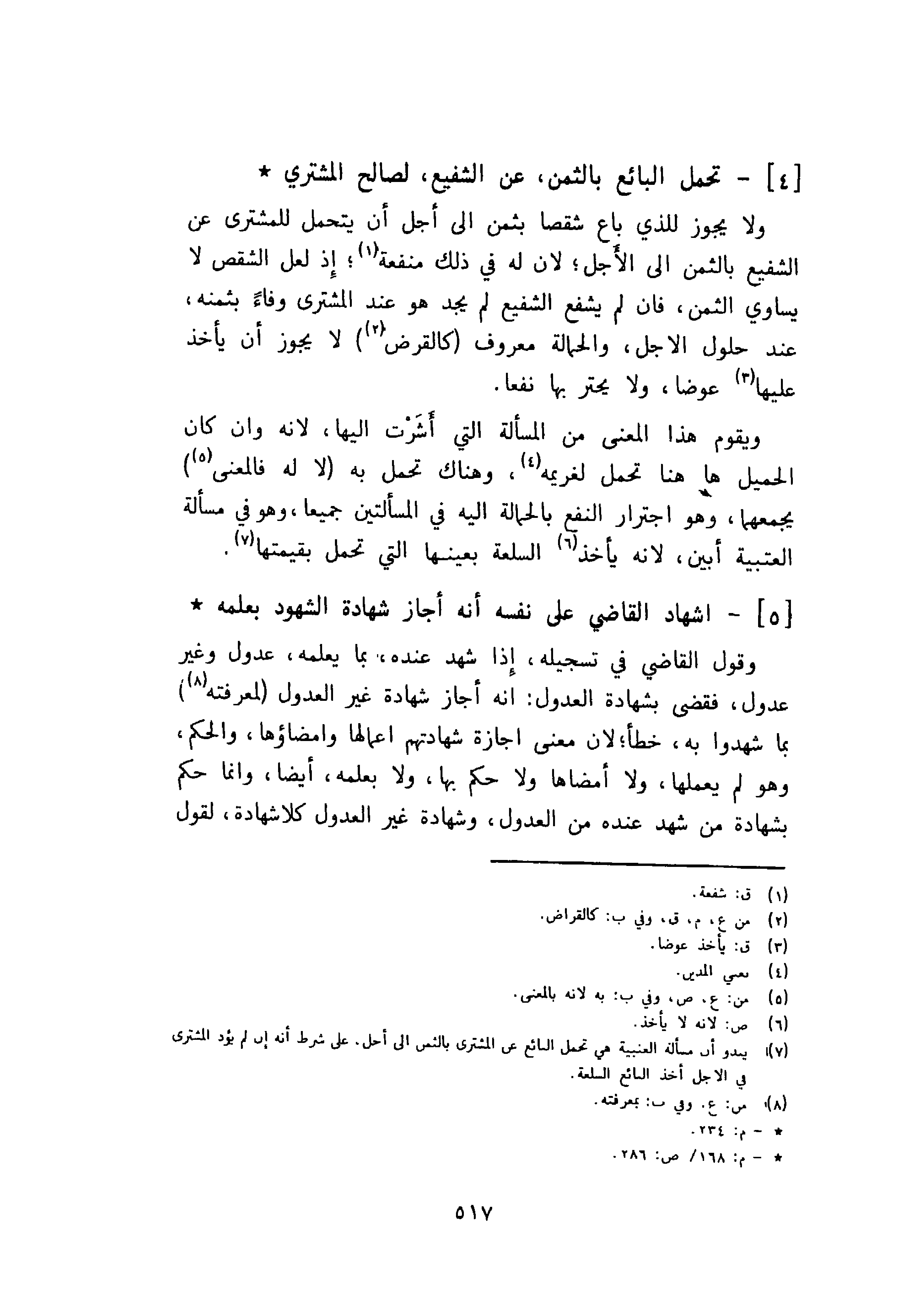 ويقوم هذا المعنى من المسألة التى أشرت اليها، لانه وان كان الحميل ها هنا تحمل لغريمه، وهناك تحمل به لا له فالمعنى يجمعهما، وهو اجترار النفع بالحمالة اليه في المسألتين جميعا، وهو في المسألة العتيبة أبين، لانه يأخذ السلعة بعينها التى تحمل بقيمتها.