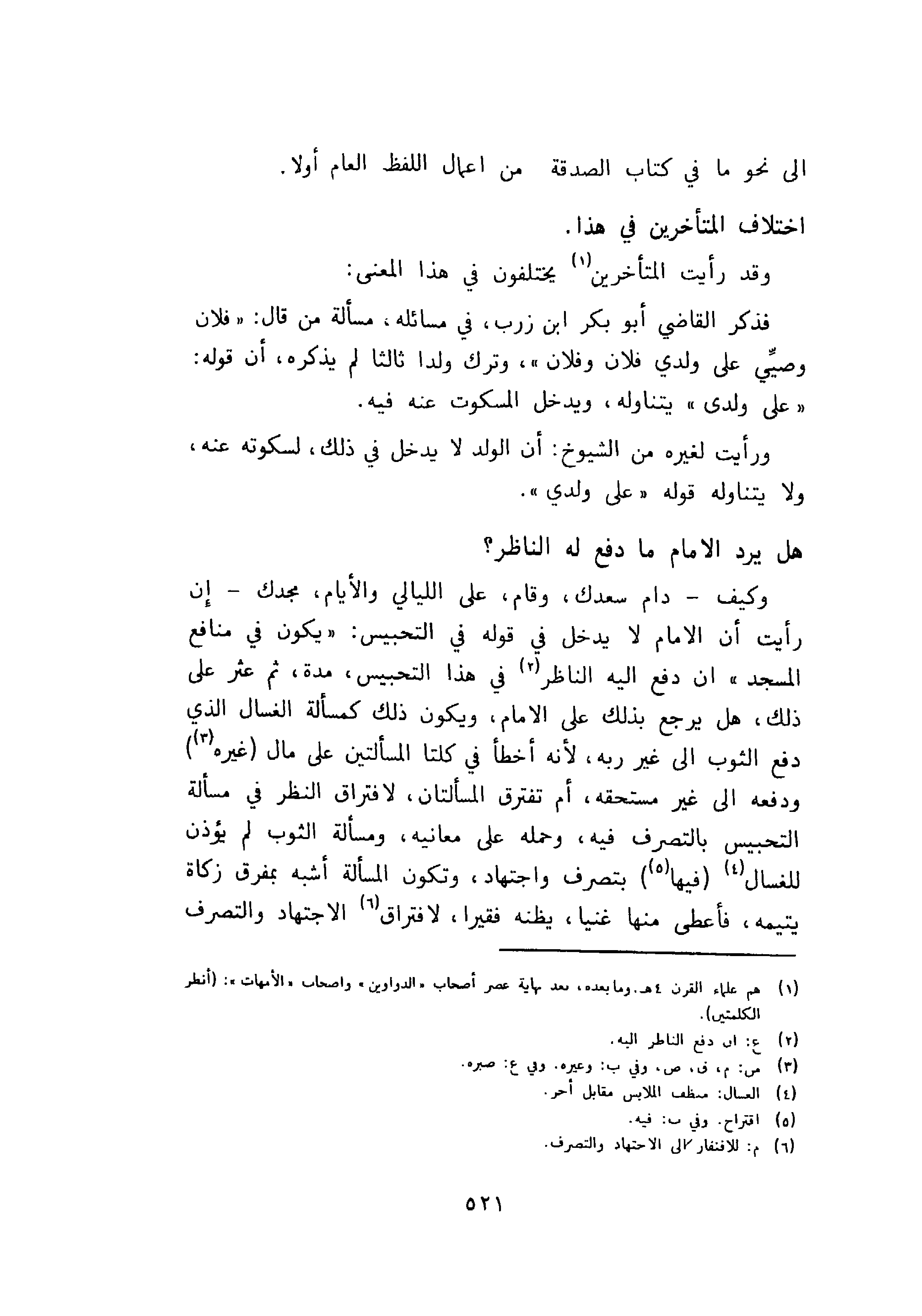 وكيف – دام عدك، وقام، على الليالي والأيام، مجدك – إن رأيت أن الإمام لا يدخل في قوله في التحبيس: يكون في منافع المسجد ان دفع اليه الناظر في هذا التحبيس، مدة، ثم عثر على ذلك، هل يرجع بذلك على الإمام، ويكون ذلك كمسألة الغسال الذي دفع الثوب إلى غير ربه، لأنه أخطأ في كلتا المسألتين على مال غيره ودفعه إلى غير مستحقه، أم تفترق المسألتان، لافتراق النظر في مسألة التحبيس بالتصرف فيه، وحمله على معانيه، ومسألة الثوب لم يؤذن للغسال فيها بتصرف واجتهاد، وتكون المسألة أشبه بمفرق زكاة يتيمة، فأعطى منها غنيا، يظنه فقيرا، لافتراق الاجتهاد والتصرف