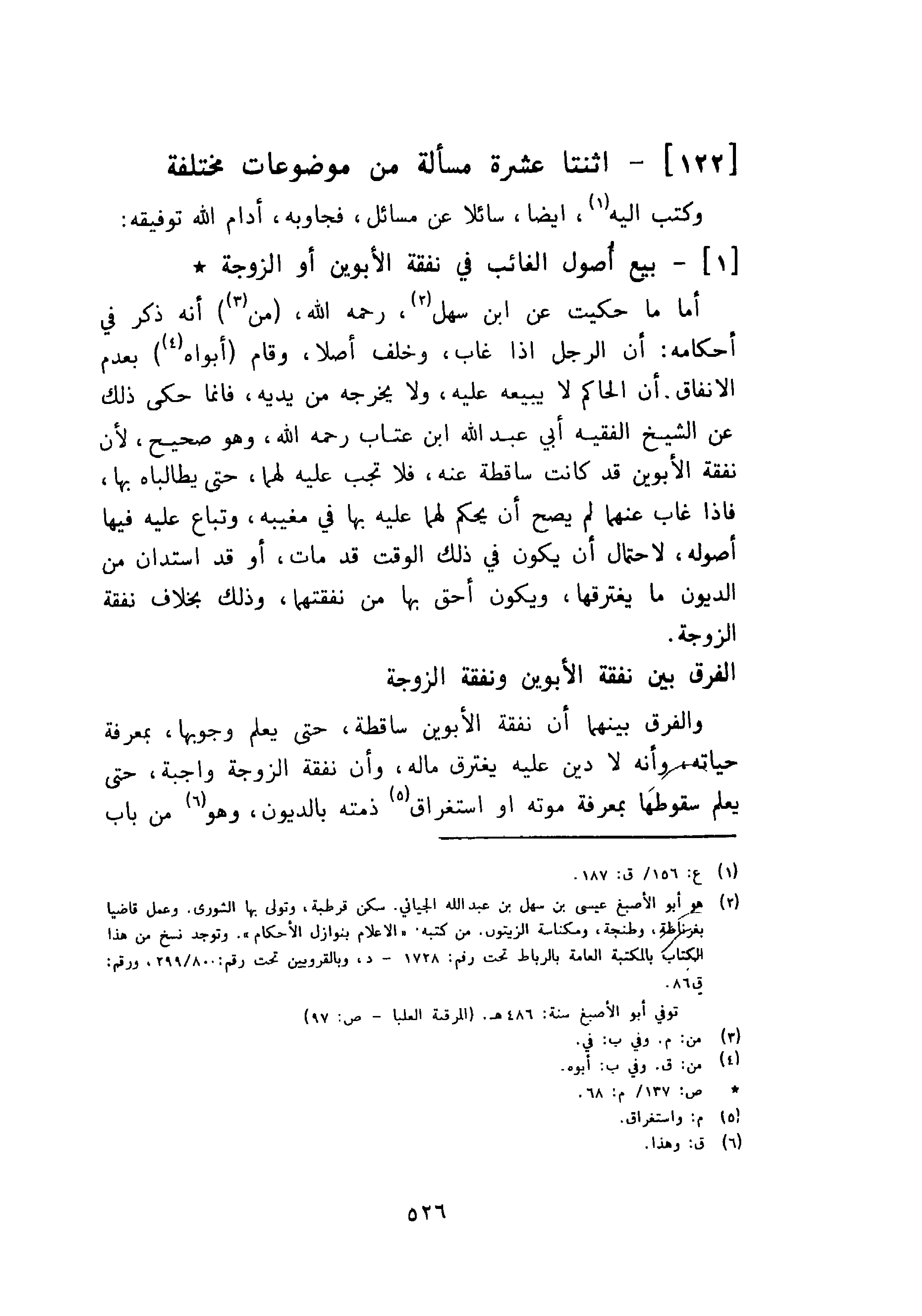 [1]- بيع أصول الغائب في نفقة الأبوين أو الزوجة