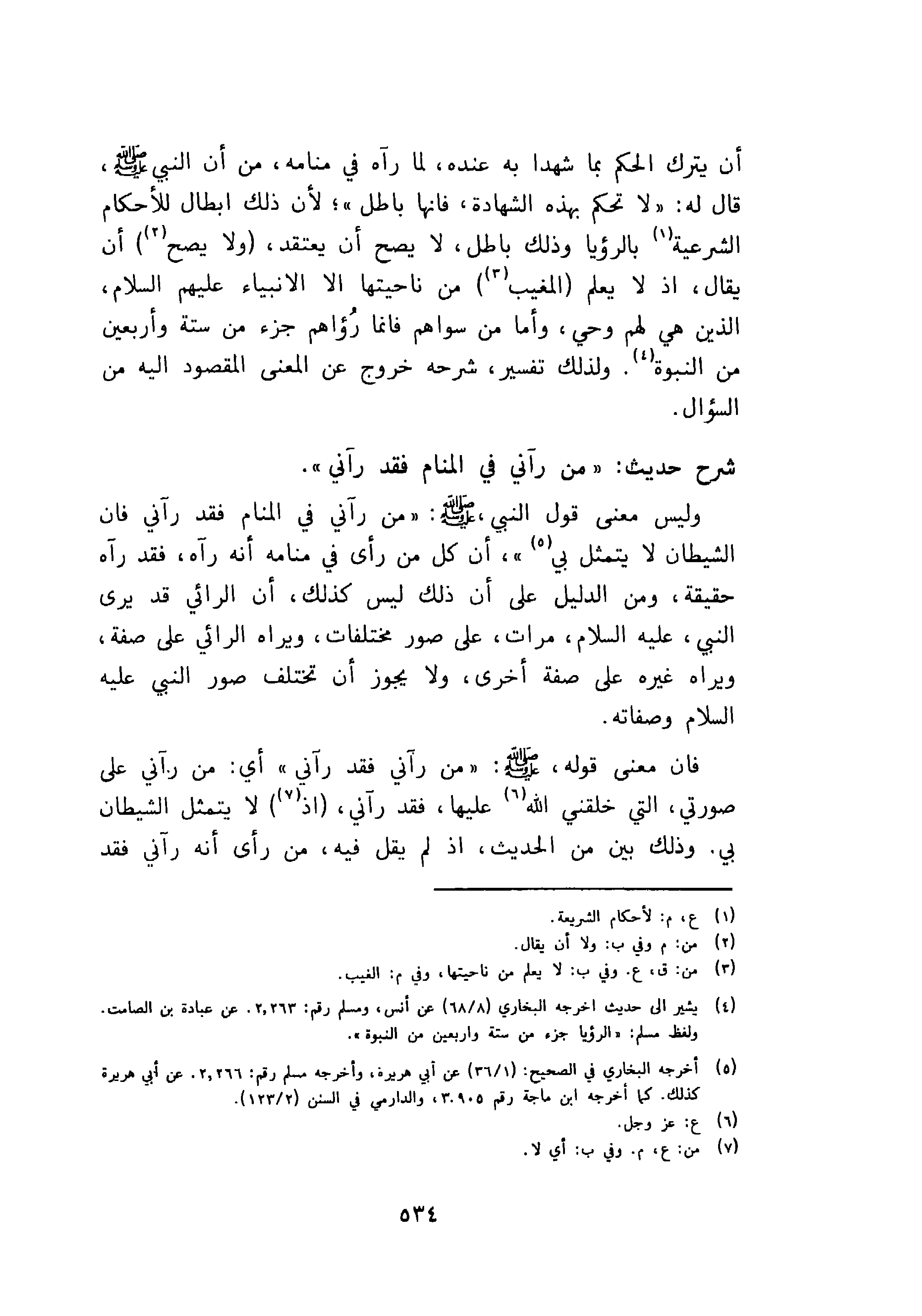 وليس معنى قول النبي صلى الله عليه وسلم {من رآني في المنام فقد رآني فان الشيطان لا يتمثل بي} أن كل من رأى في منامه أنه رآه فقد رآه حقيقة، ومن الدليل على أن ذلك ليس كذلك، أن الرائي قد يرى النبي، عليه السلام، مرات على صور مختلفات، ويراه الرائي على صفة ويراه غيره على صفة أخرى، ولا يجوز أن تختلف صور النبي عليه السلام وصفاته.