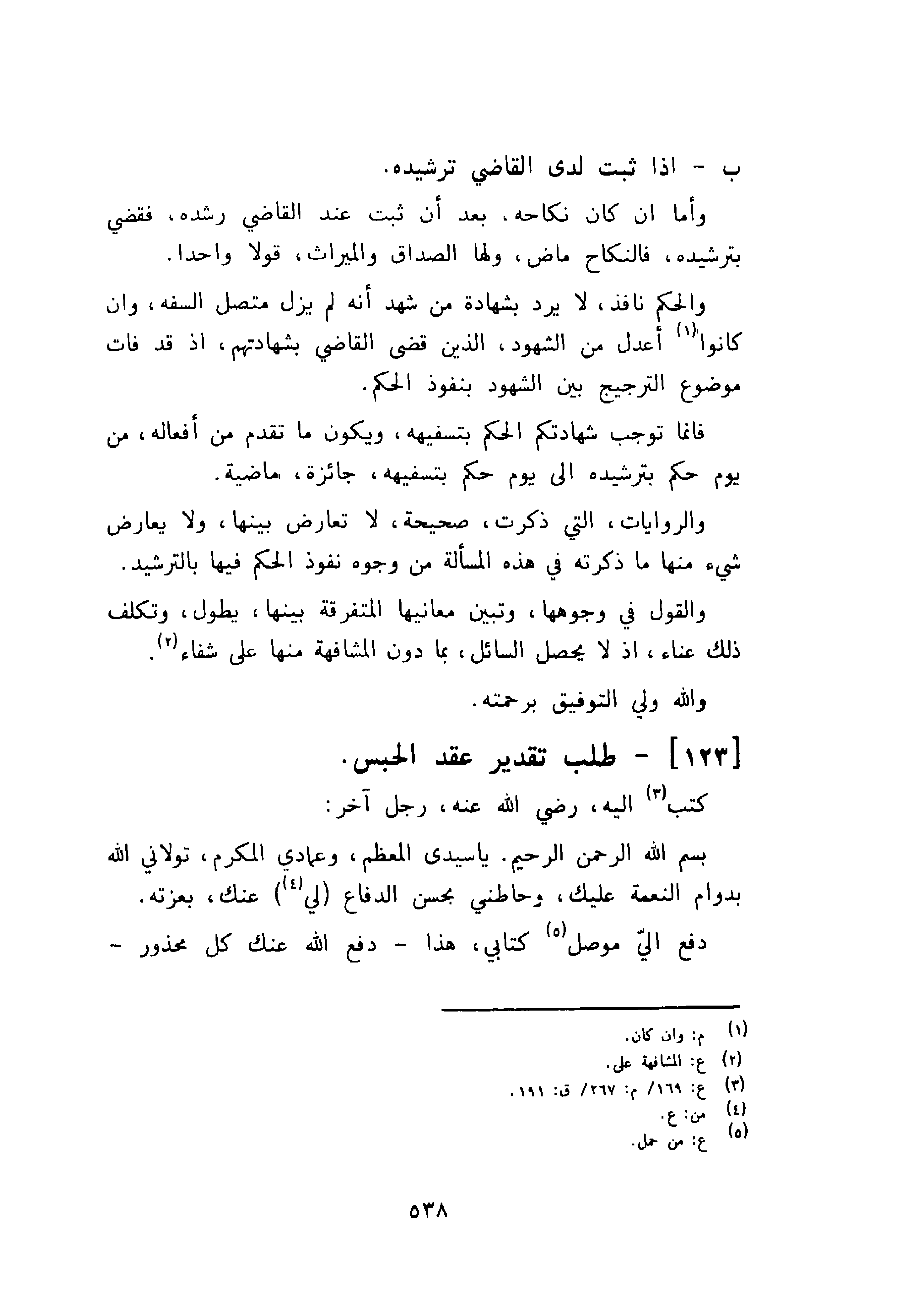 والروايات، التي ذكرت، صحيحة لا تعارض بينها، ولا يعارض شيء منها ما ذكرته في المسألة من وجوه نفوذ الحكم فيها بالترشيد.