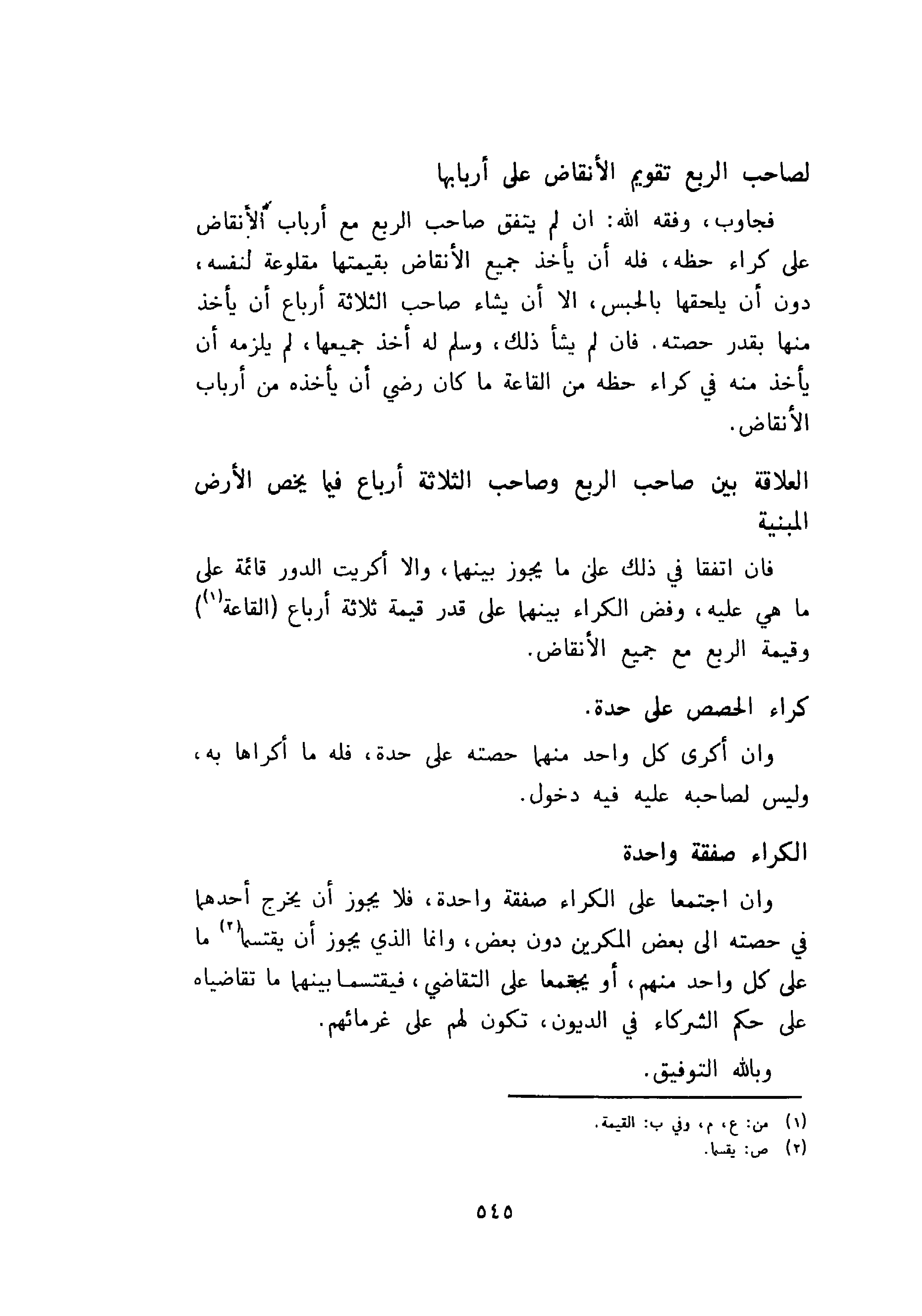 فجاوب، وفقه الله: ان لم يتفق صاحب الربع مع أرباب الأنقاض على كراء حظه، فله أن يأخذ جميع الأنقاض بقيمتها مقلوعة لنفسه، دون أن يلحقها بالحبس، الا أن يشاء صاحب الثلاثة أرباع أن يأخذ منها بقدر حصته. فان لم يشأ ذلك، وسلم له أخذ جميعها، لم يلزمه أن يأخذ منه في كراء حظه من القاعة ما كان رضي أن يأخذه من أرباب الأنقاض.