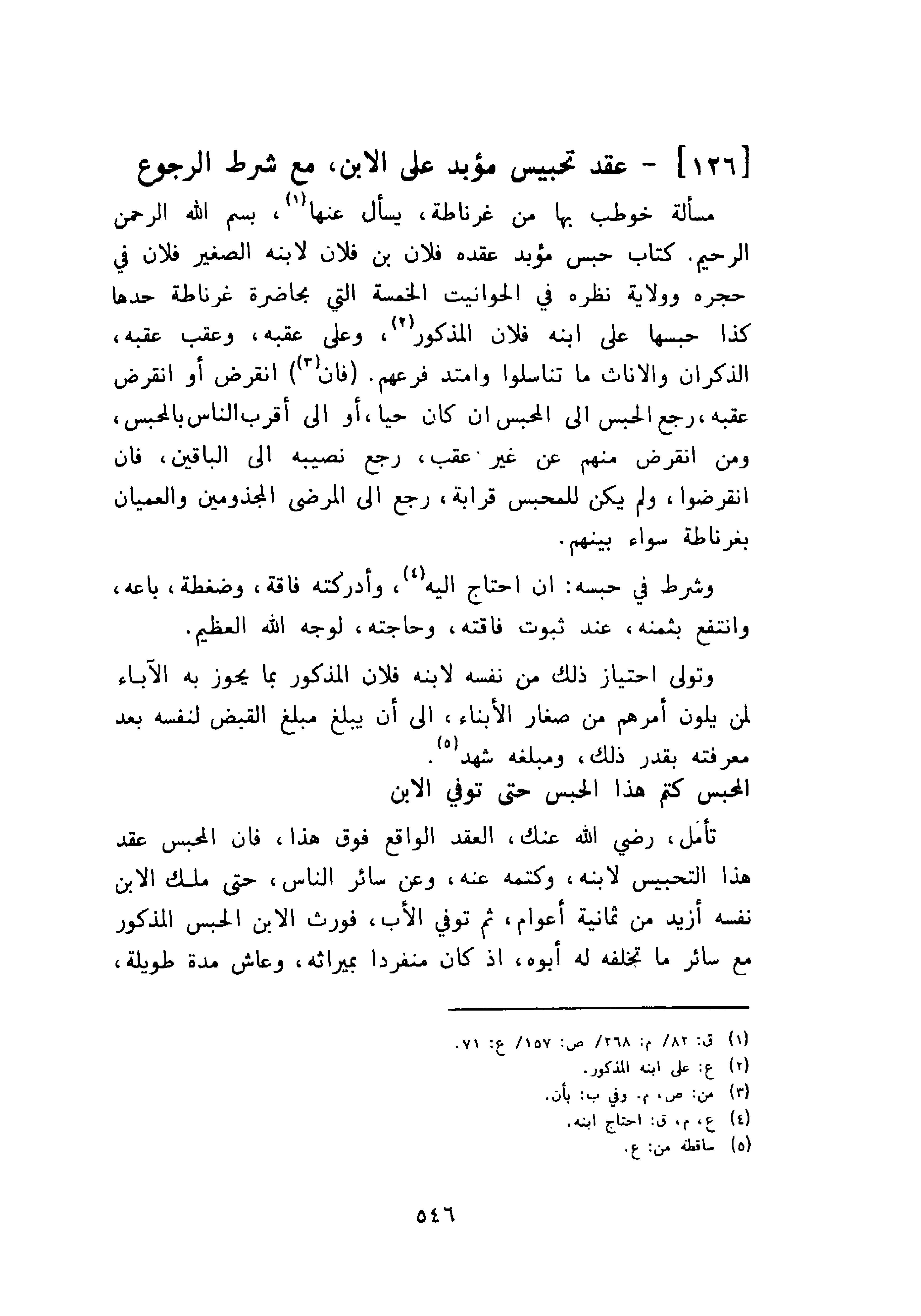 مسألة خوطب بها من غرناطة، يسأل عنها، بِسْمِ اللَّهِ الرَّحْمَنِ الرَّحِيمِ. كتاب حبس مؤبد عقده فلان بن فلان لابنه الصغير فلان في حجره وولاية نظره في الحوانيت الخمسة التي بحاضره غرناطة حدها كذا حبسها على ابنه فلان المذكور، وعلى عقبه وعقب عقبه، الذكران والاناث ما تناسلوا وامتد فرعهم. فان انقرض أو انقرض عقبه، رجع الحبس إلى الحبس ان كان حيا، أو إلى أقرب الناس بالمحبس، ومن انقرض منهم عن غير عقب، رجع نصيبه إلى الباقين، فان انقرضوا، ولم يكن للمحبس قرابة، رجع إلى المرضى المجذومين والعميان بغرناطة سواء بينهم.