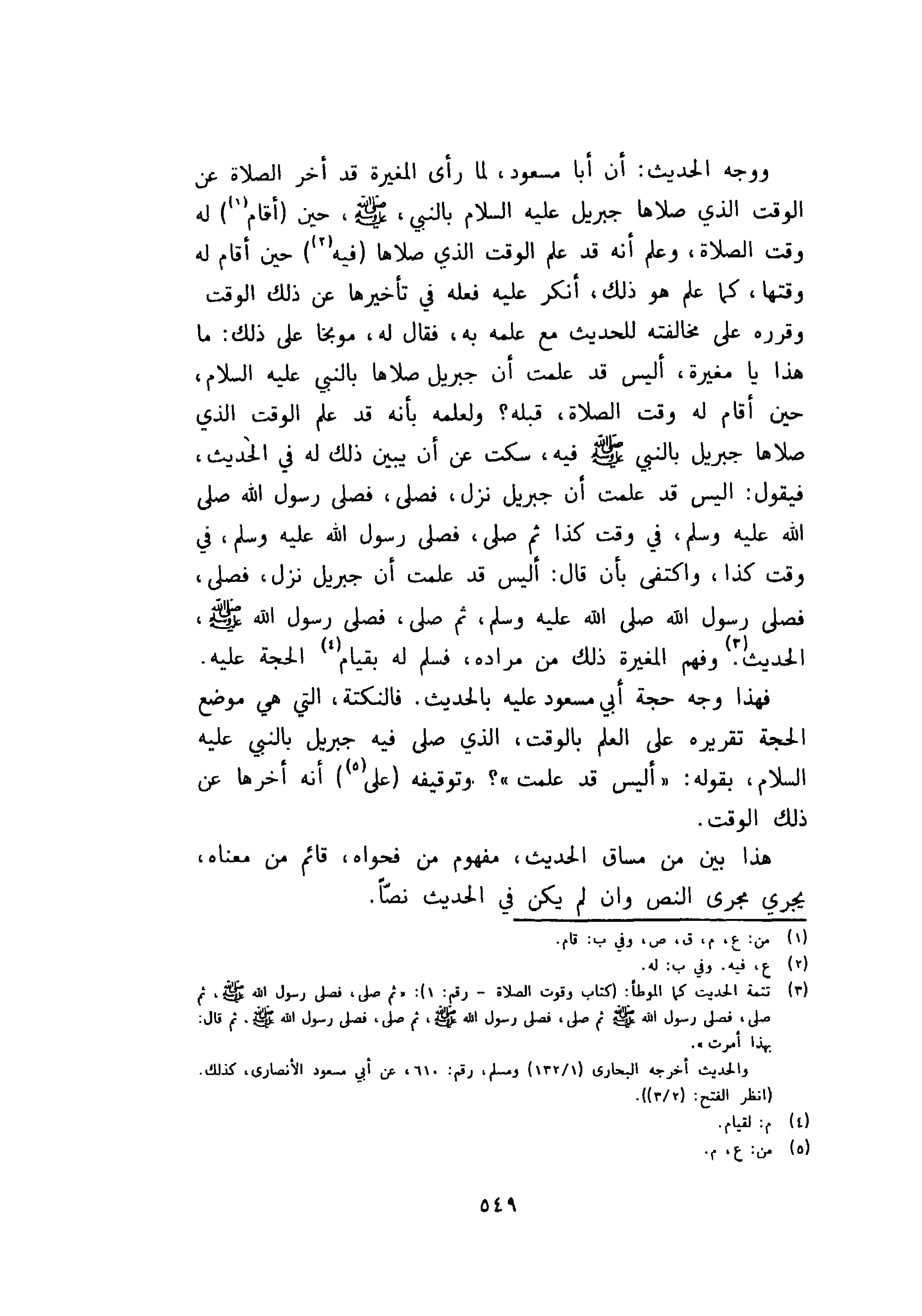 ووجه الحديث: أن أبا مسعود، لما رأى المغيرة قد أخر الصلاة عن الوقت الذي صلاها جبريل عليه السلام بالنبي، صلى الله عليه وسلم، حين أقام له وقت الصلاة، وعلم أنه قد علم الوقت الذي صلاها فيه حين أقام له وقتها، كما علم هو ذلك، أنكر عليه فعله في تأخيرها عن ذلك الوقت وقرره على مخالفته للحديث مع علمه به، فقال له، موبخا على ذلك: ما هذا يا مغيرة، أليس قد علمت أن جبريل صلاها بالنبي عليه السلام حين أقام له وقت الصلاة، قبله؟ ولعلمه بأنه قد علم الوقت الذي صلاها جبريل بالنبي صلى الله عليه وسلم فيه، سكت عن أن يبين ذلك له في الحديث فيقول: اليس قد علمت أن جبريل نزل، فصلى فصلى رسول صلى الله عليه وسلم، في وقت كذا ثم صلى، فصلى الله عليه وسلم في وقت كذا، واكتفى بأن قال: أليس قد علمت أن جبريل نزل فصلى الله عليه وسلم ثم صلى، فصلى الله عليه وسلم الحديث وفهم المغيرة ذلك من مراده، فسلم له بقيام الحجة عليه، فهذا وجه حجة أبي مسعود عليه بالحديث. فالنكتة، التي هي موضع الحجة تقريره على العلم بالوقت، الذي صلى فيه جبريل بالنبي عليه السلام، بقوله: أليس قد علمت؟ وتوفيقه على أنه آخرها عن ذلك الوقت.