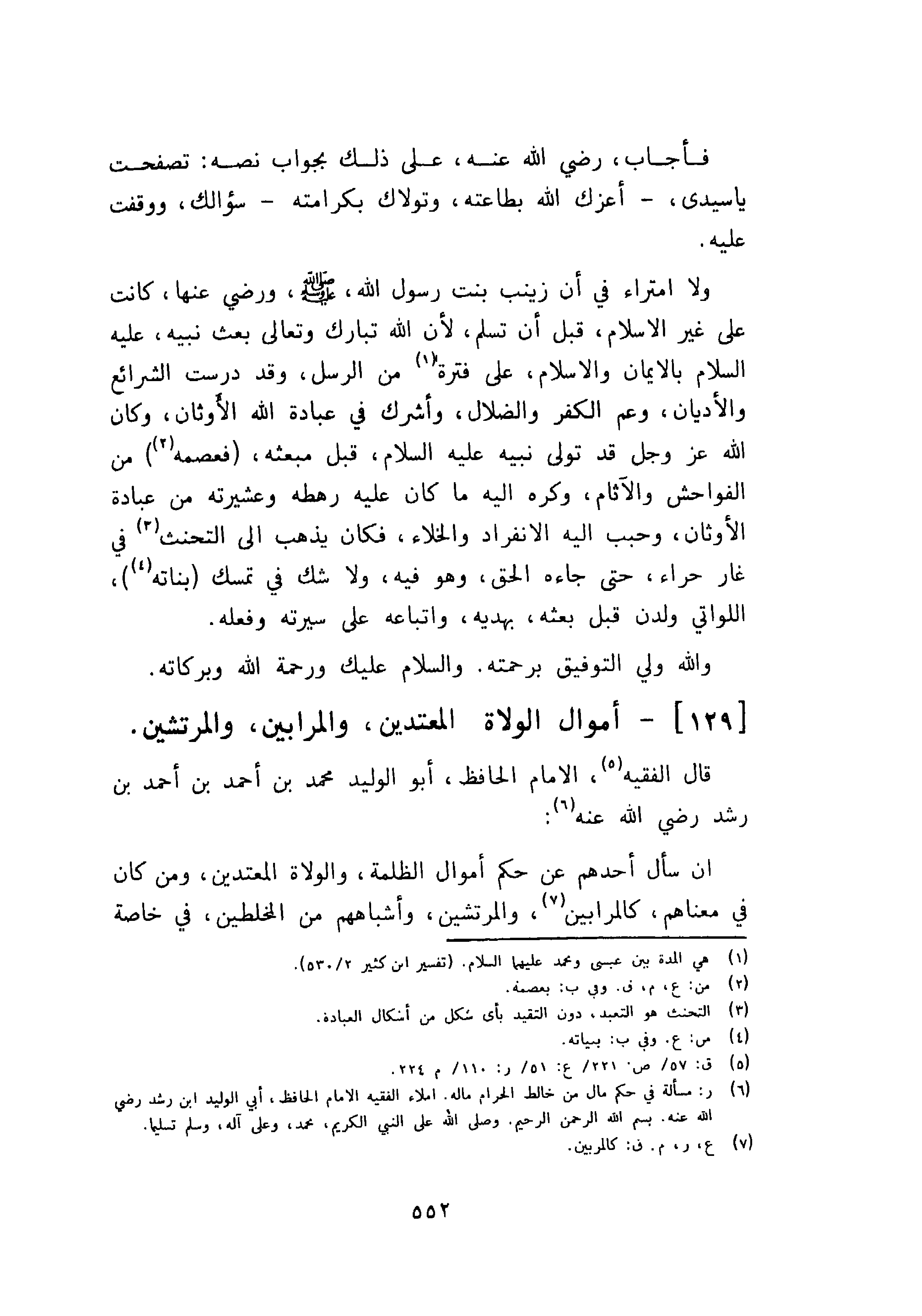 فأجاب، رضي الله عنه، على ذلك بجواب نصه: تصفحت يا سيدى، أعزك الله بطاعته، وتولاك بكرمته - سؤالك ووقفت عليه.
